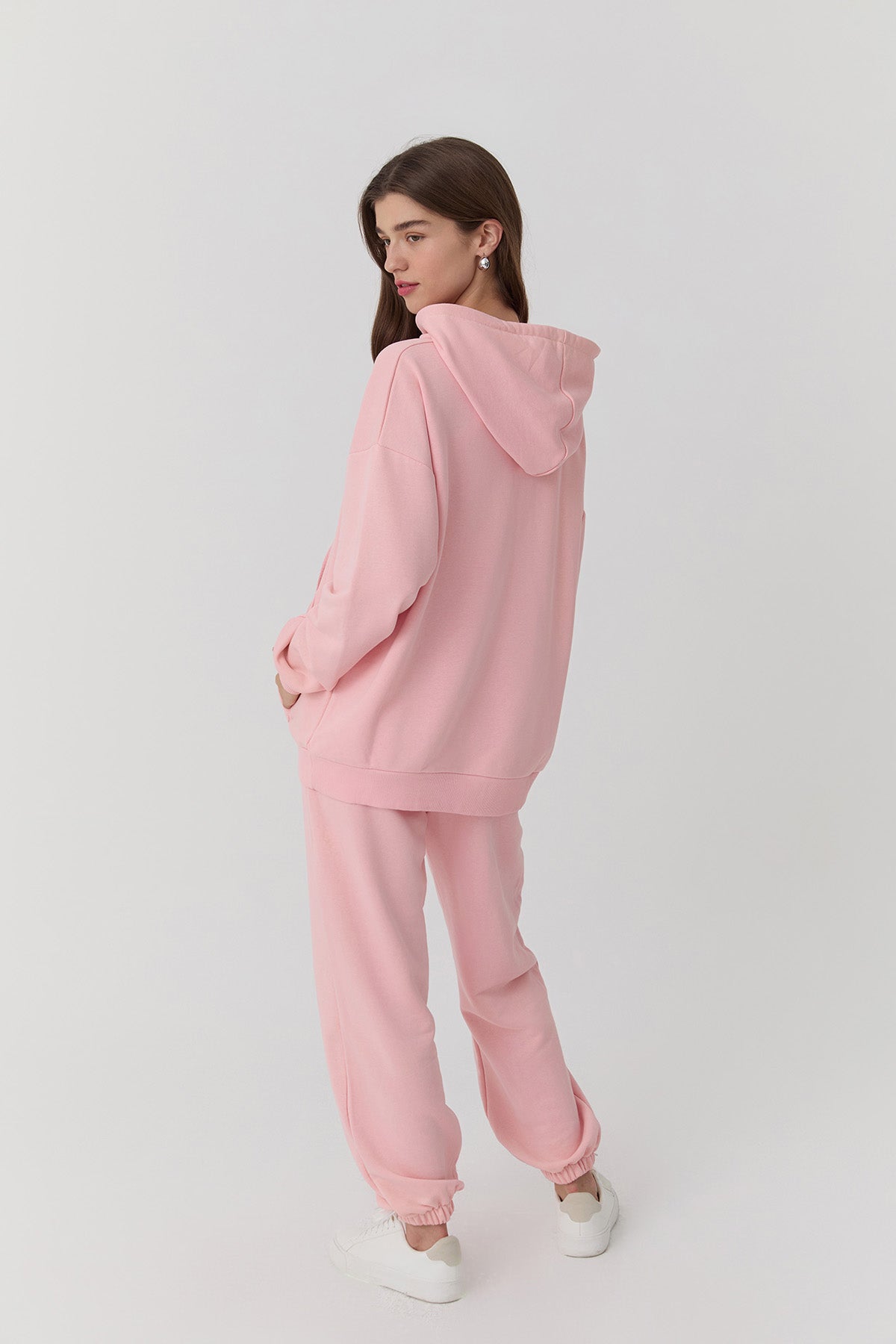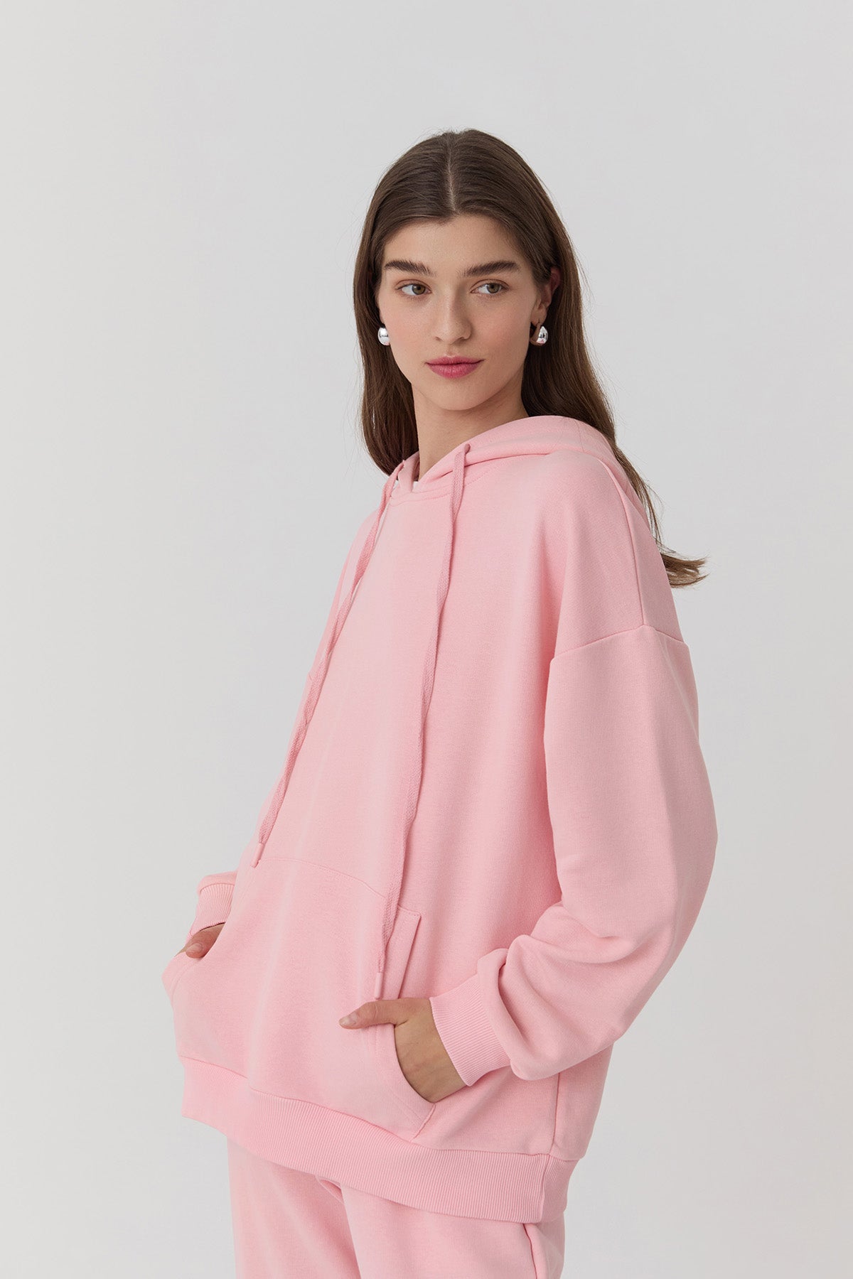 Oversized sweatshirt with a hood, long sleeves, kangaroo pocket, cotton content.