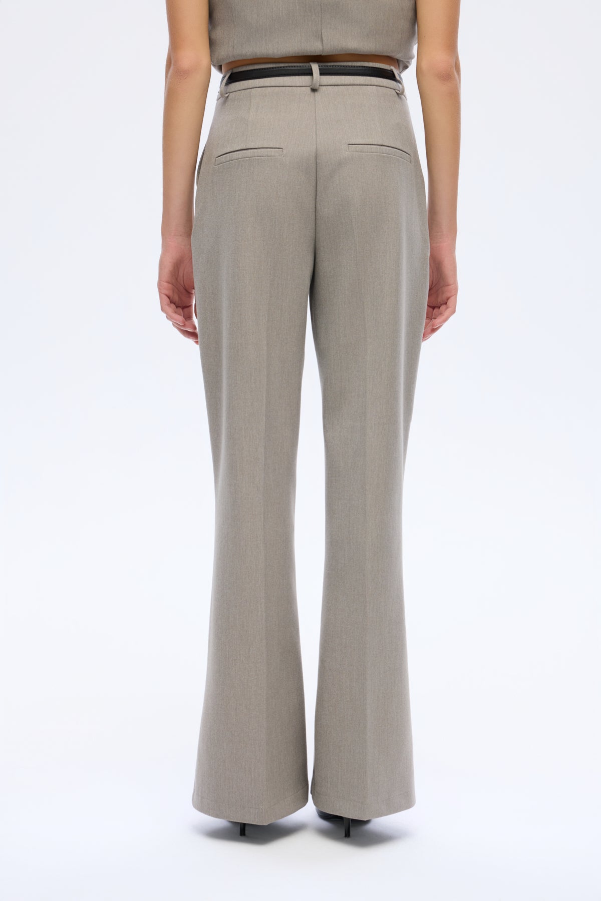 İnce kemer aksesuarı ile tamamlanmış, yüksek bel, fermuar ve kanca kapamalı, arkası gizli cepli, ispanyol paça pantolon.