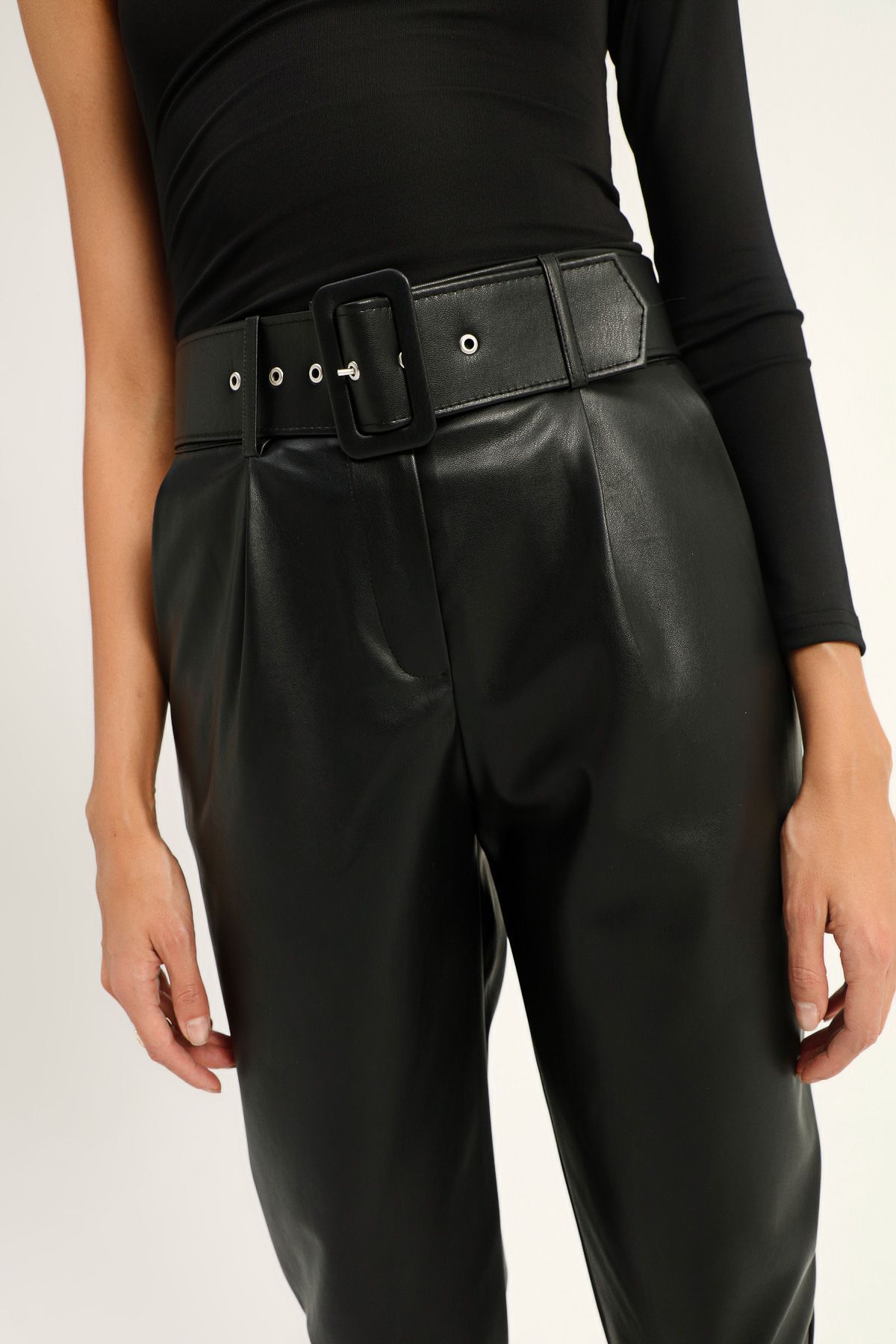 Take the pulse of street fashion with vegan leather trousers with thick belt detail! With the high-waisted and belted leather trousers model, you can combine basic pieces or enjoy your creativity with cropped blouses or knitwear. Be proud of yourself while wearing your belted leather trousers, which are produced without harming nature and animals. Do not forget that we are always with you for a sustainable world!