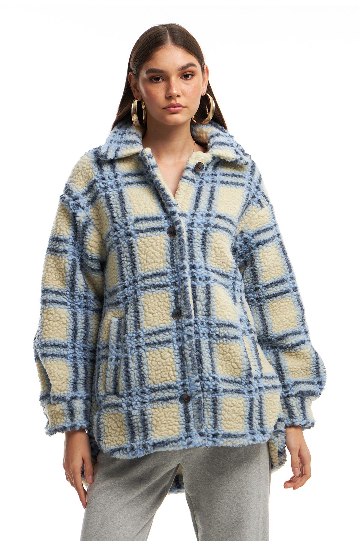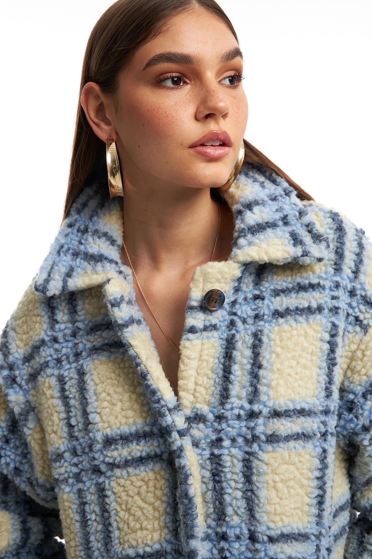 Short, plush coat with wool content, button fastening, long sleeves, inner lining, shirt collar, oversized fit.