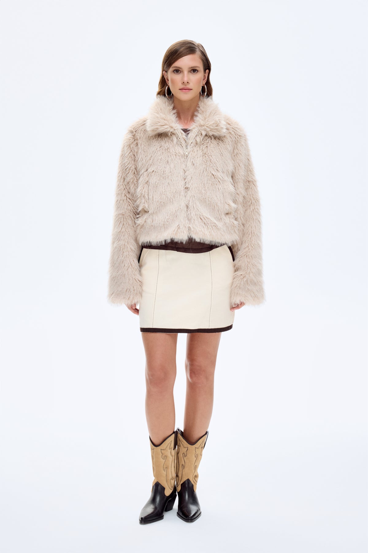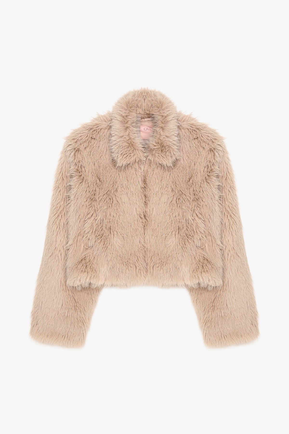 İçi astarlı, uzun kollu, suni kürk görünümlü, yumuşak dokulu, yandan cepli, önü fermuar kapamalı, kısa kürk ceket.