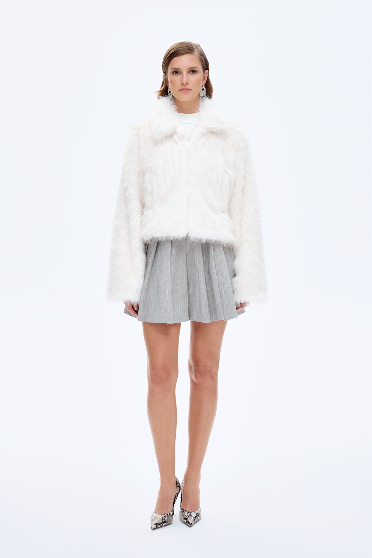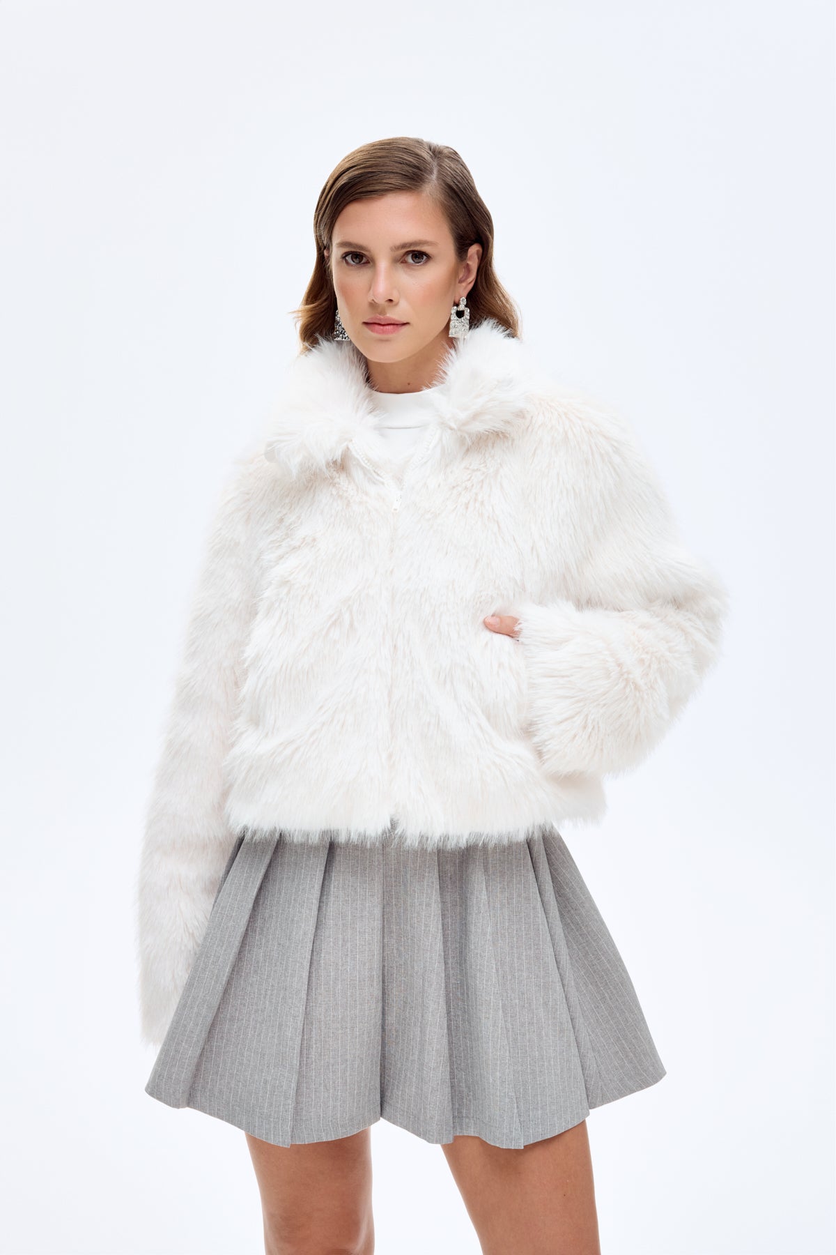 İçi astarlı, uzun kollu, suni kürk görünümlü, yumuşak dokulu, yandan cepli, önü fermuar kapamalı, kısa kürk ceket.