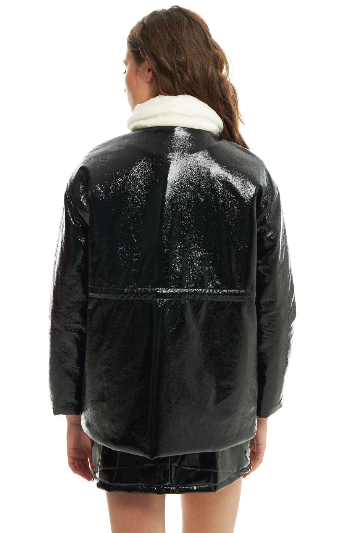 Short coat in patent leather with a plush collar and belt detail, adjustable waist by shrinking, long sleeves, three pockets, snap button fastening, metallic zip fastening. Get ready to combine both your soul and your energy with the fur detailed patent leather coat model! Let the brilliance of this piece, with which you will be the perfect couple, and the romantic atmosphere of your combinations reflect your style… You will not be able to give up the patent leather coat that protects you against the cold while creating distinctive combinations with patterned mini dresses or mini skirts…