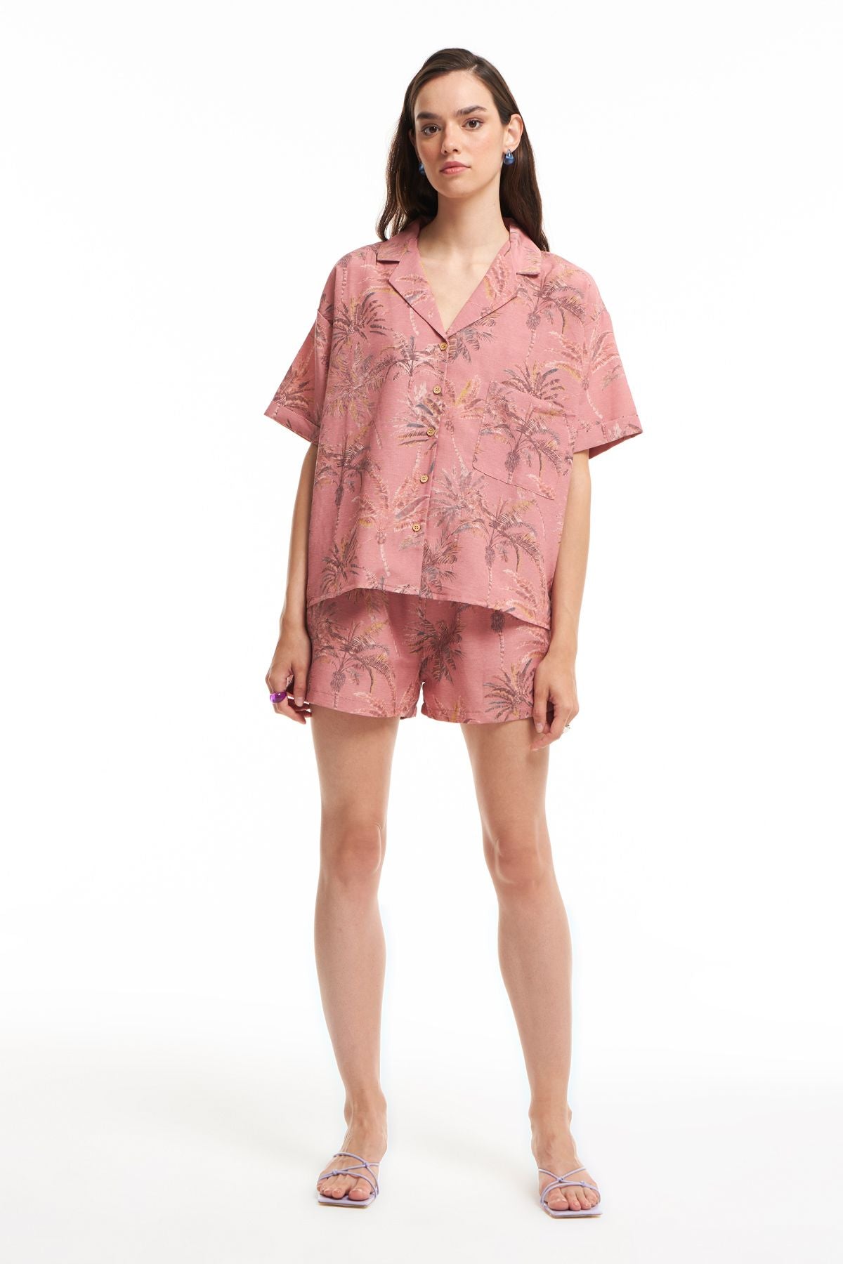 Linen, cotton and viscose blended fabric, single pocket, oversize cut, team shorts available, short sleeve, patterned shirt.