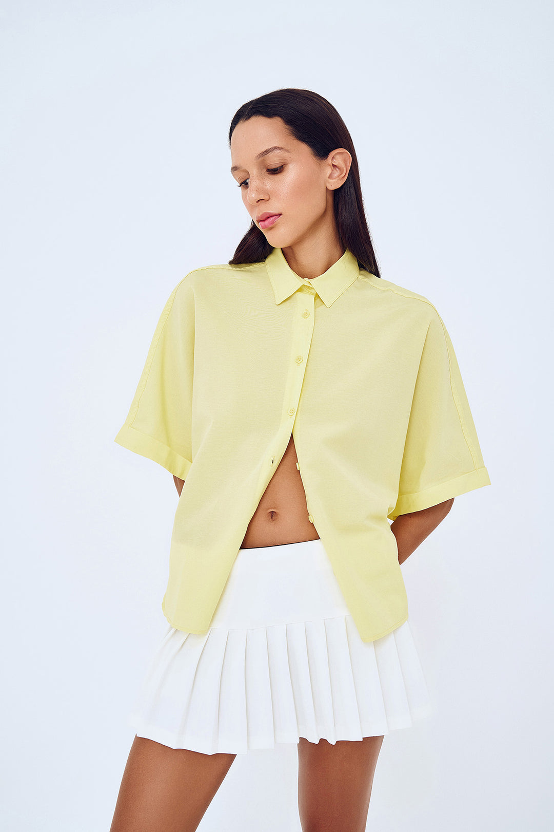 Önü düğmeli, oversize, kısa kollu gömlek.