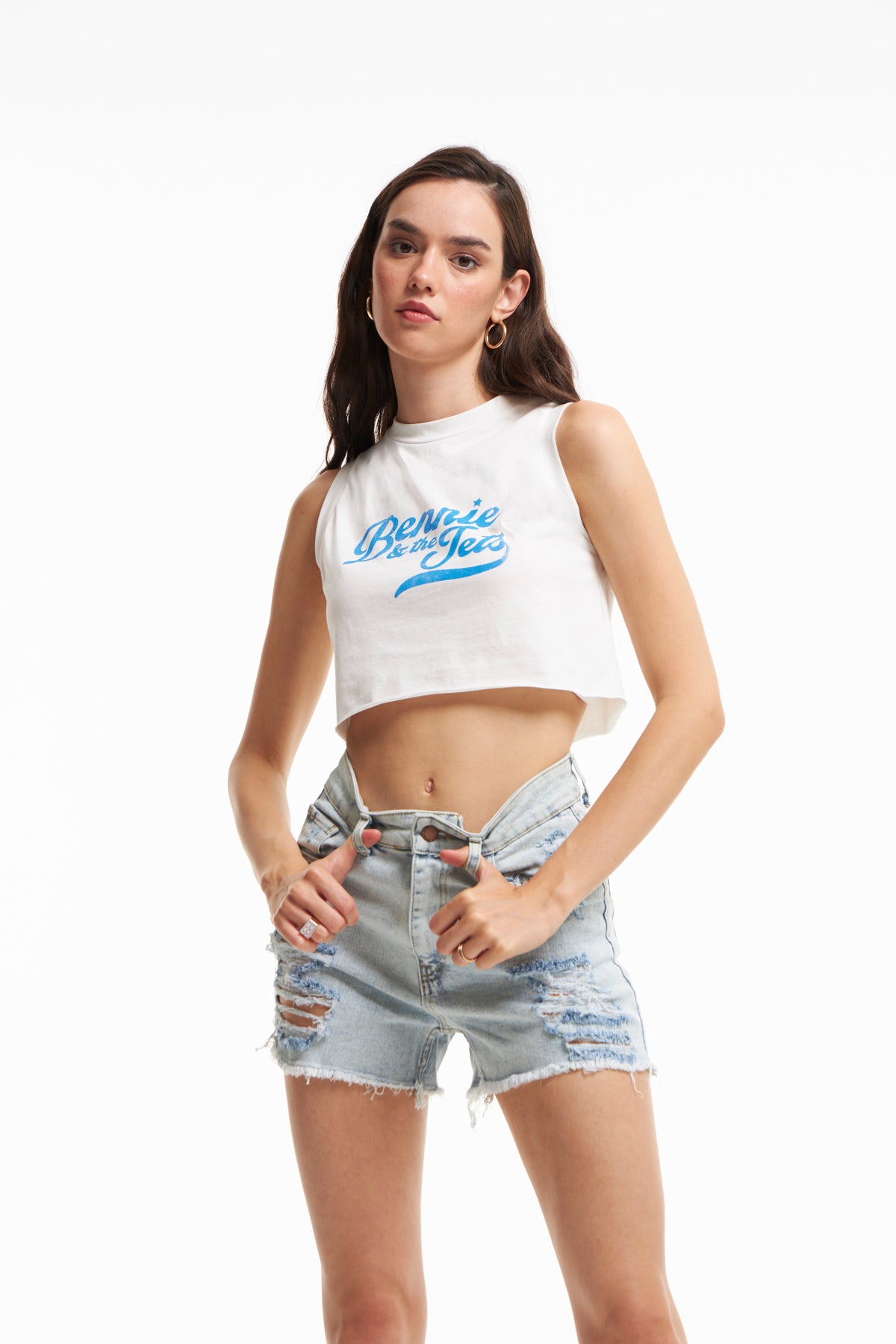 The printed sleeveless t-shirt model has a comfortable use on hot summer days with its 100% cotton structure and cut. You can effortlessly create a sporty look by combining the crop sleeveless T-shirt model with our skirt and shorts models.