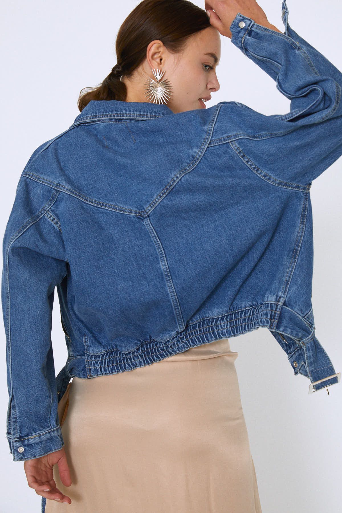Belt Detailed Zippered Denim Jacket Blue