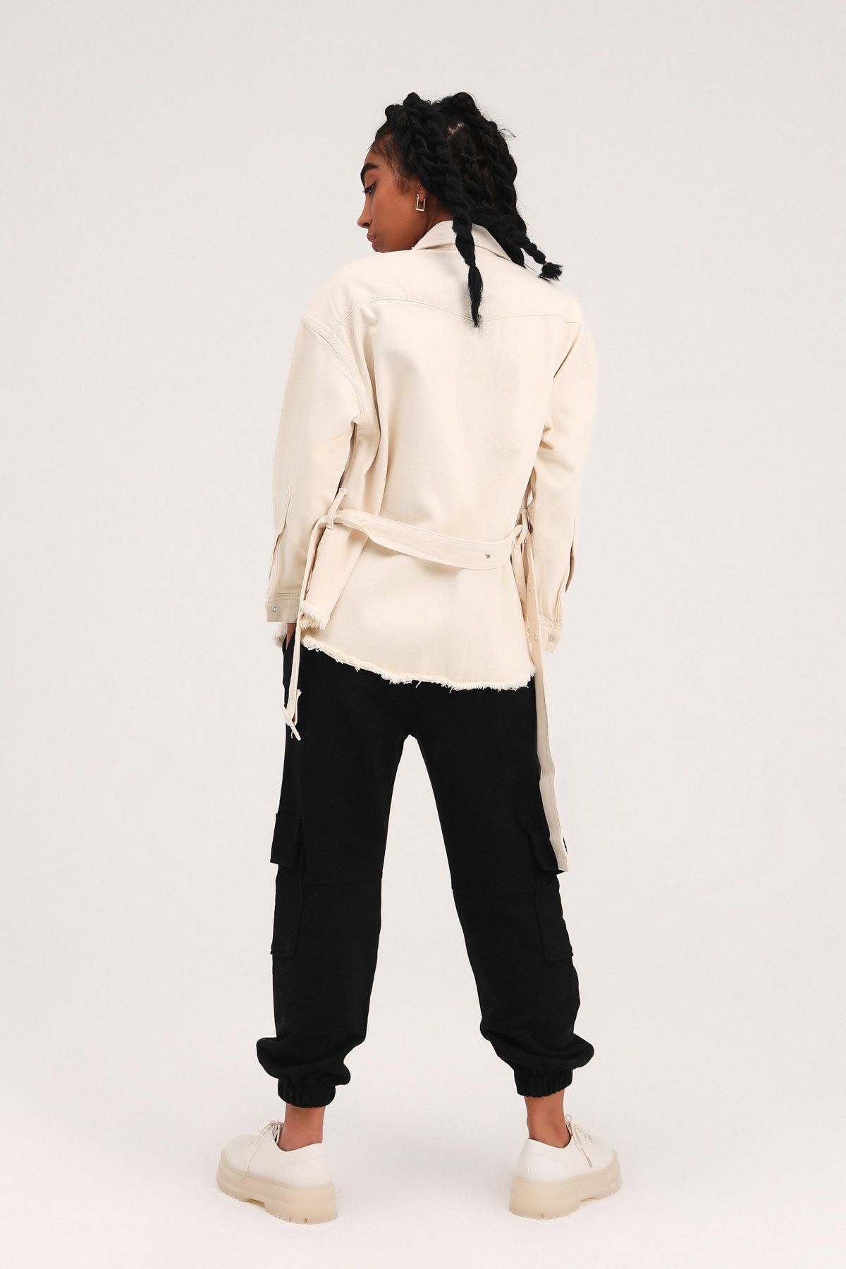 The belted denim jacket, which gives an energetic structure with the tassel details on the end, is one of the savior pieces of cool weather.