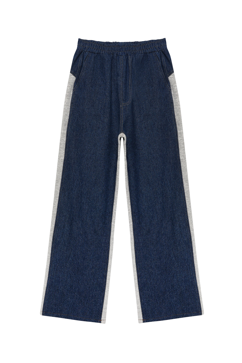 Yüksek bel, denim detaylı, beli lastikli, bol paça pantolon.