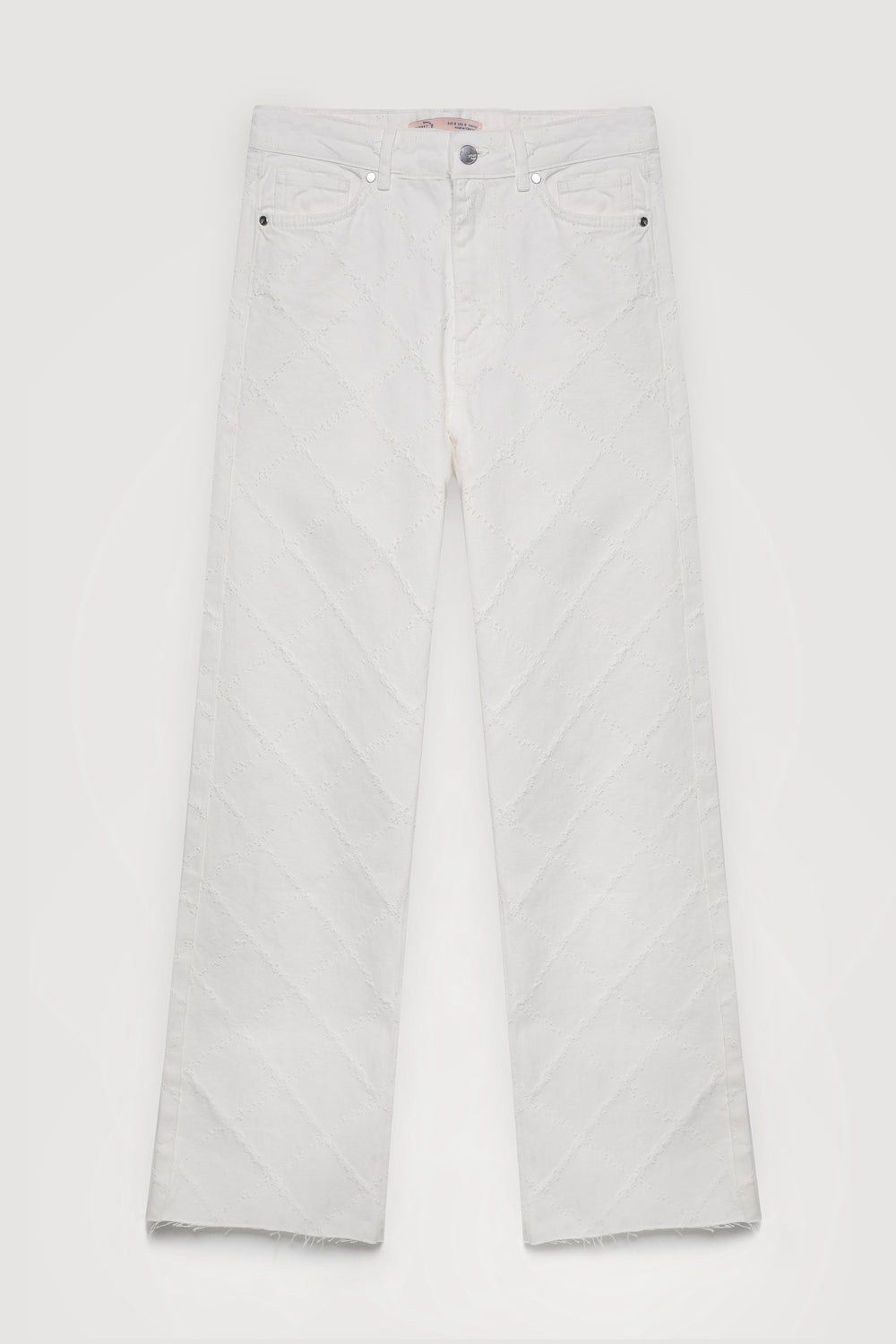 Çapraz örgü dikiş detaylı, yüksek bel, düz paça tasarımlı, paçaları kesik, yüksek bel, çift cepli, fermuar ve düğme kapamalı kot pantolon.