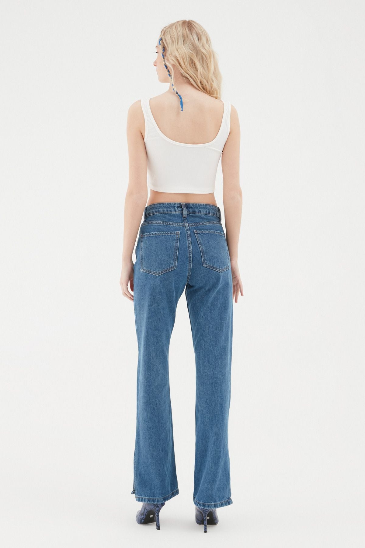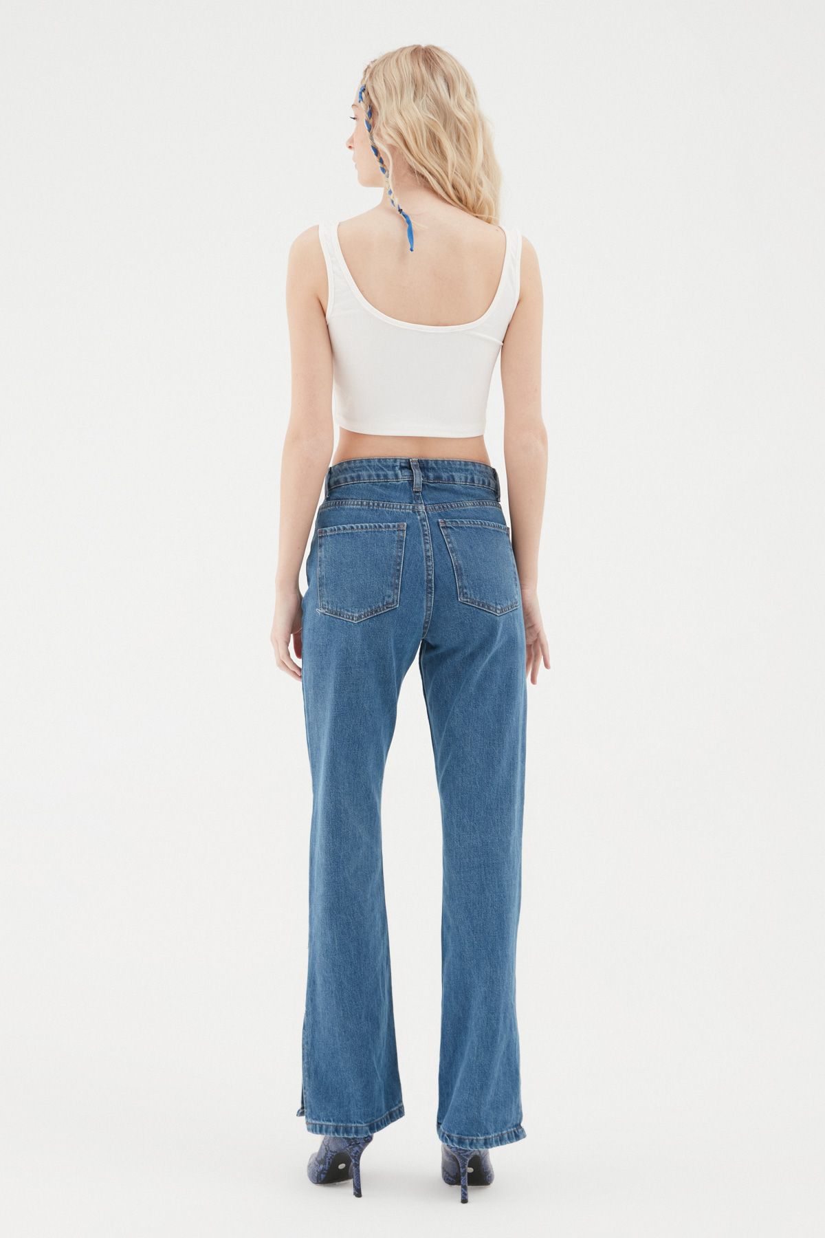 The slit detail on the leg of the high waist denim model is one of the details that increase the energy of the jeans models. It has pockets, zipper and metallic button.