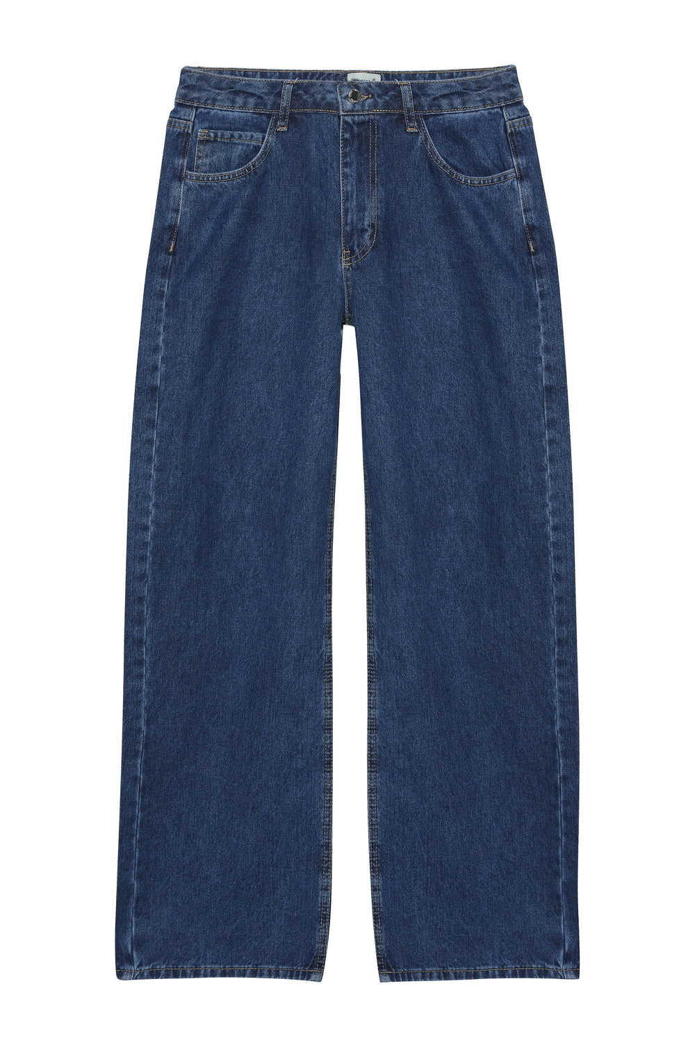 Yüksek belli, geniş paça, cepli, kot pantolon.