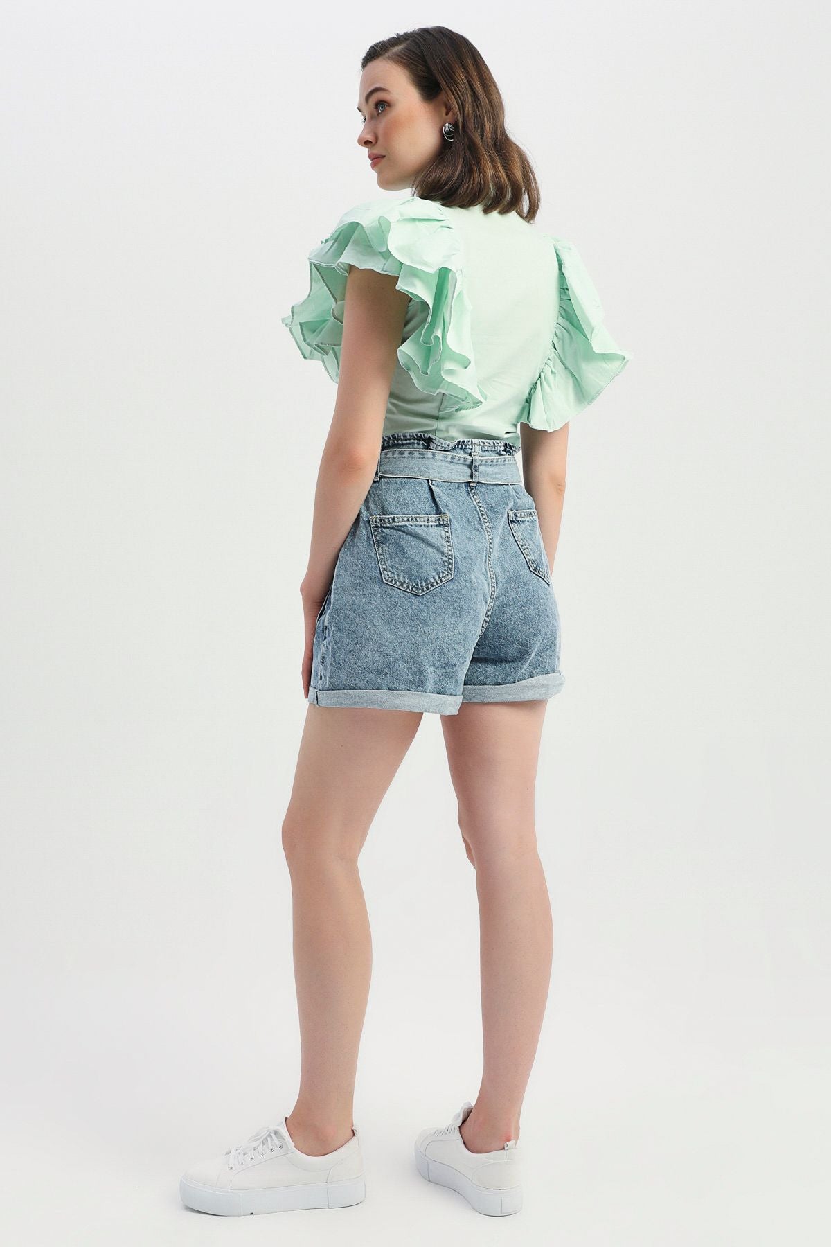 Belted High Waist Denim Shorts Light Blue