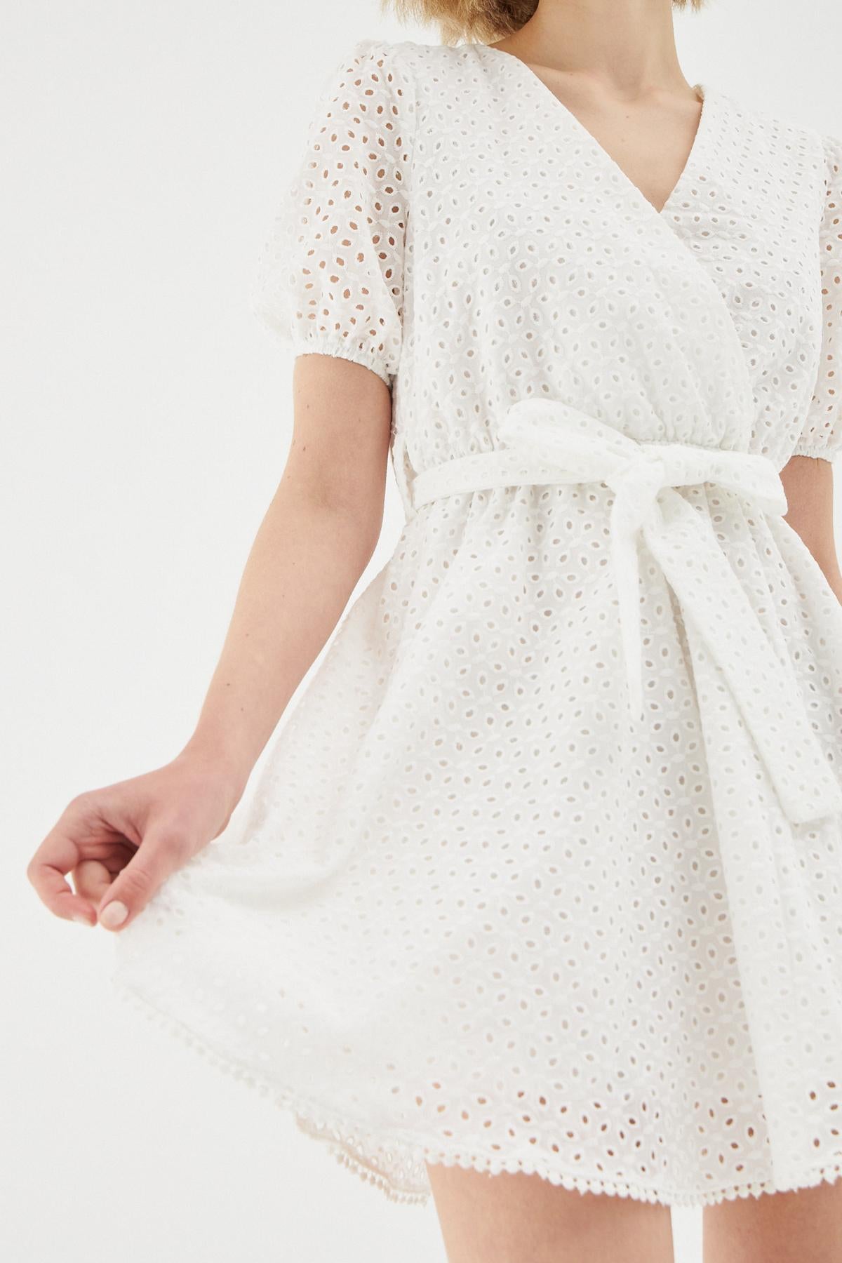 Guipure and openwork details, which have not lost their popularity by challenging the time, combine with the mini dress model to offer both a modern and sophisticated look. You can choose the belted mini dress model in spring and summer combinations. The openwork and binding details give a new form to the short sleeved dress.