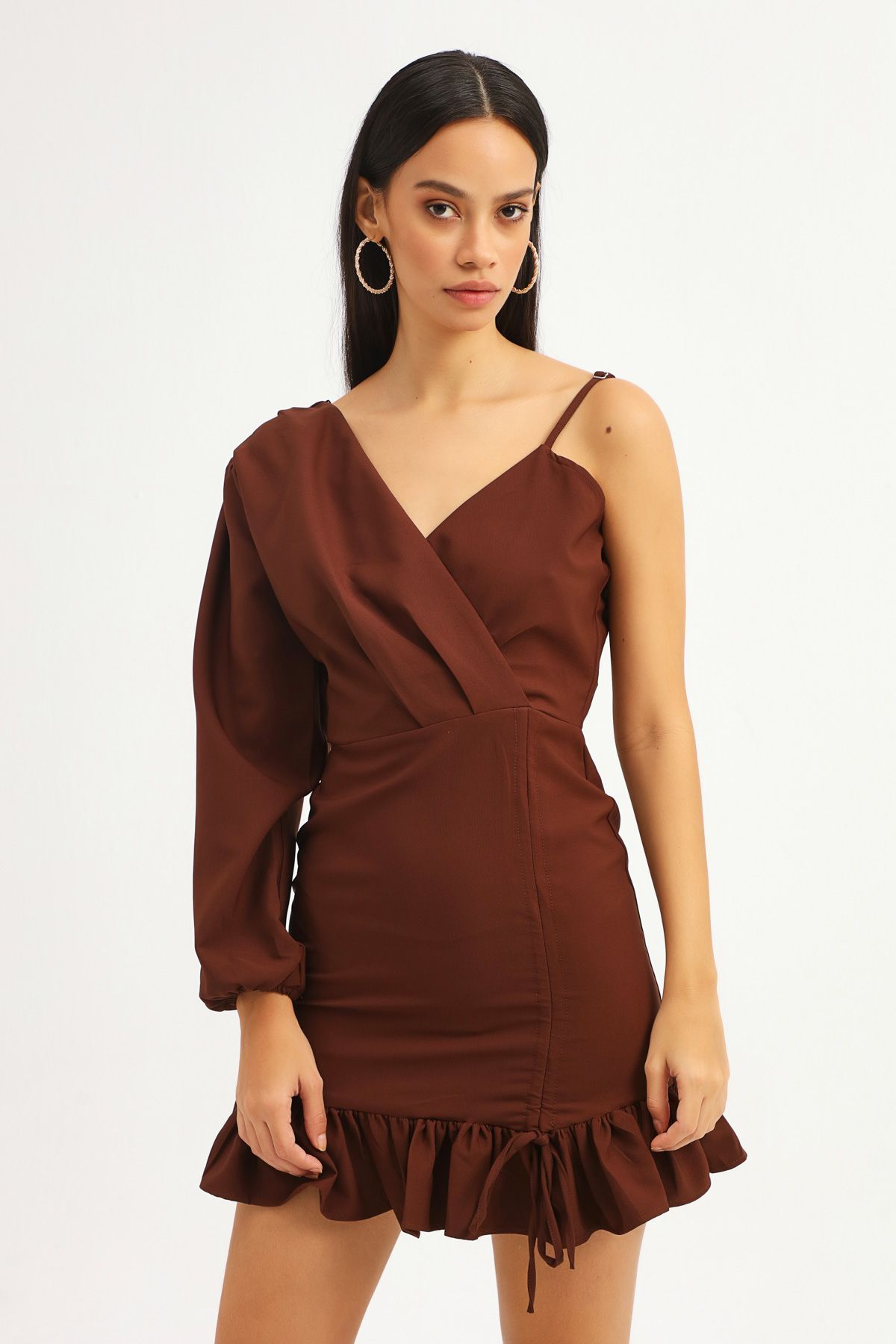 Pleated Asymmetrical Sleeve Dress Dark Brown