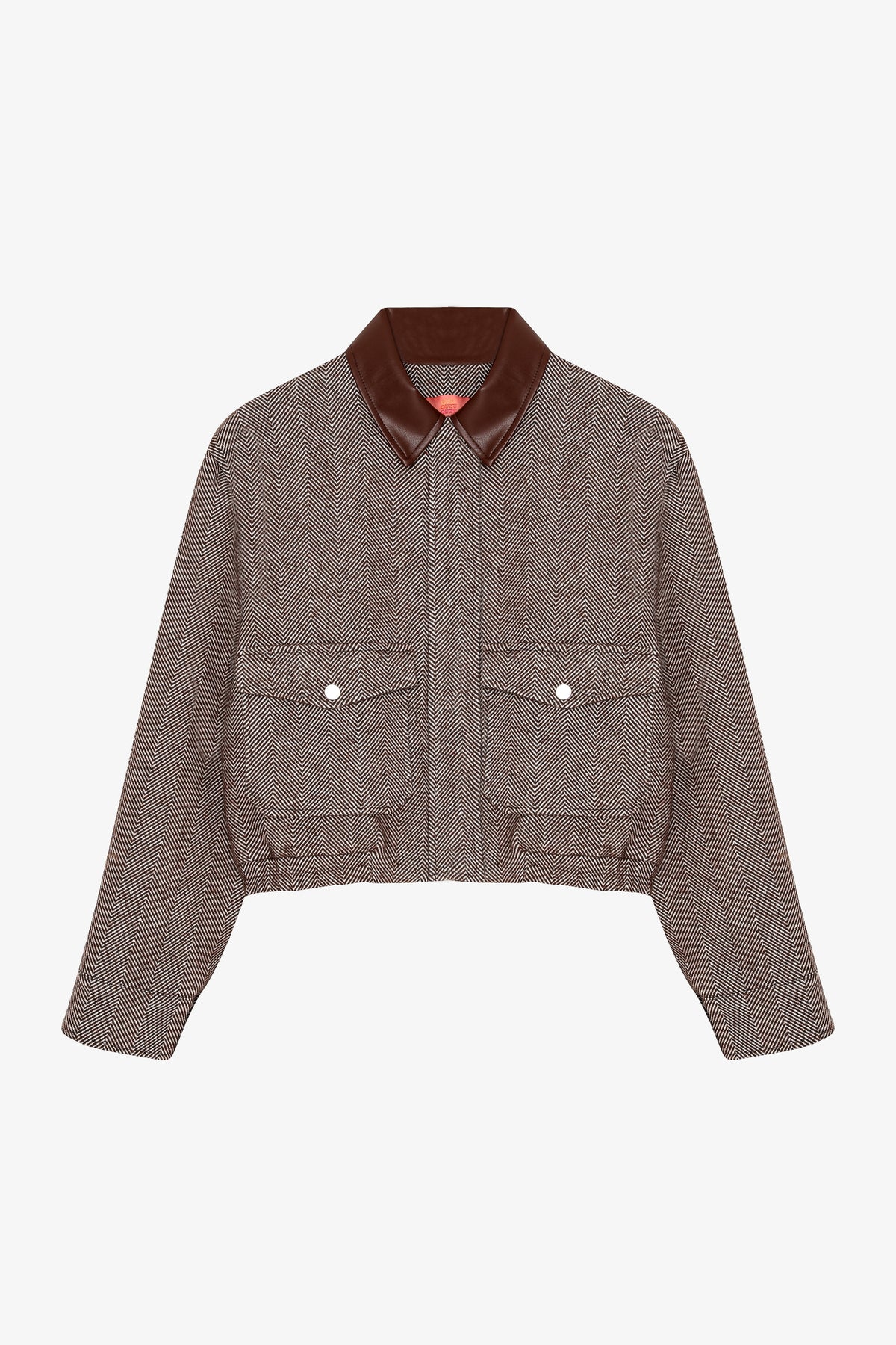 Kontrast suni deri yaka detaylı, uzun kollu, çift cepli, balıksırtı desenli, içi astarlı, fermuarlı ve gizli çıtçıt kapamalı, beli lastikli, kısa boy kaşe ceket.