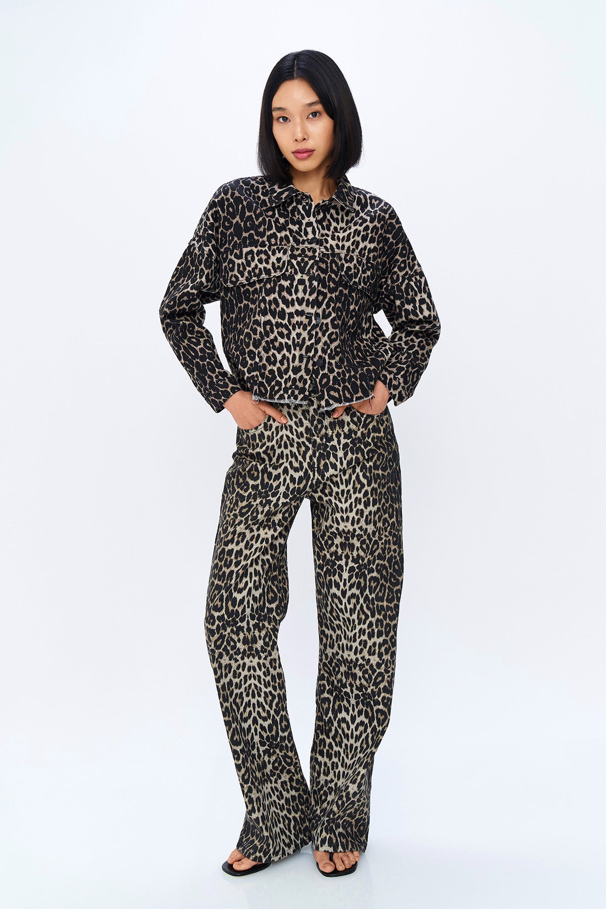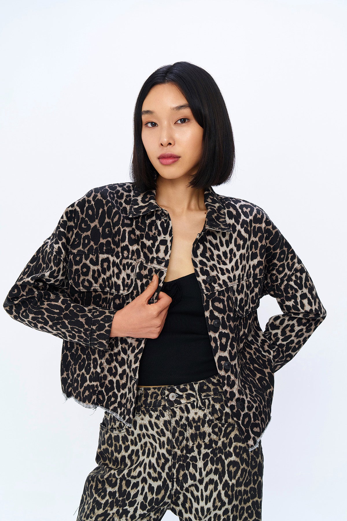uzun kollu, cepli, leopar desenli, önü düğmeli ceket.