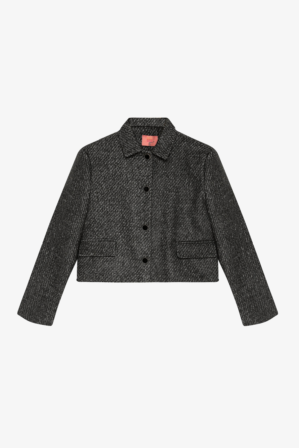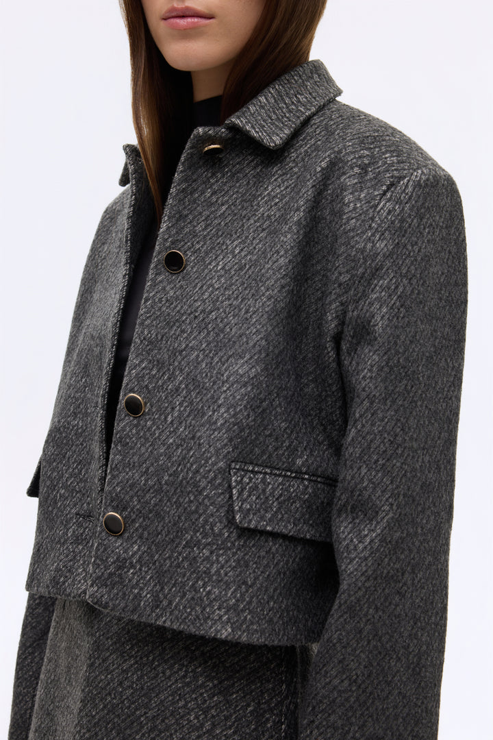 İçi kendi renginden astarlı, yuvarlak yaka, uzun kollu, düğme kapamalı, cep kapaklı, kısa ceket.