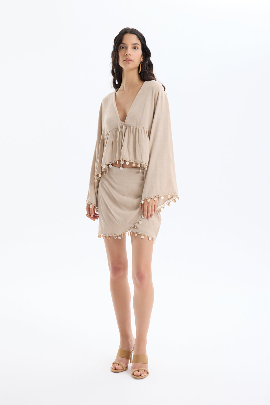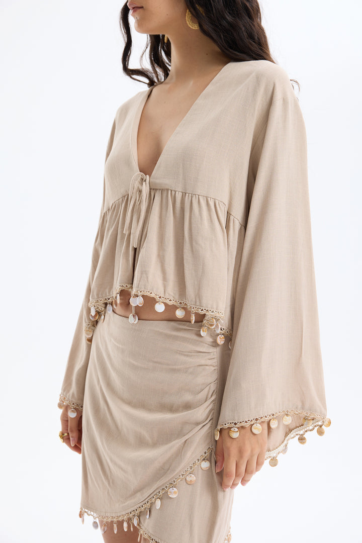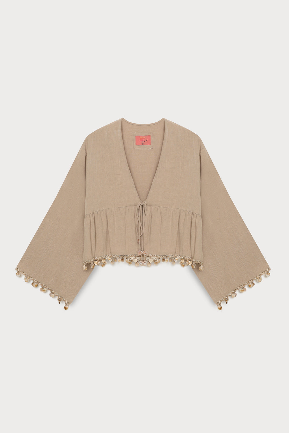 Deniz kabuğu detaylı uç süslemeleriyle hareketlendirilmiş, içi astarsız, düşük omuz, oversize, bağlamalı, geniş kol kesimli, kısa keten bluz.