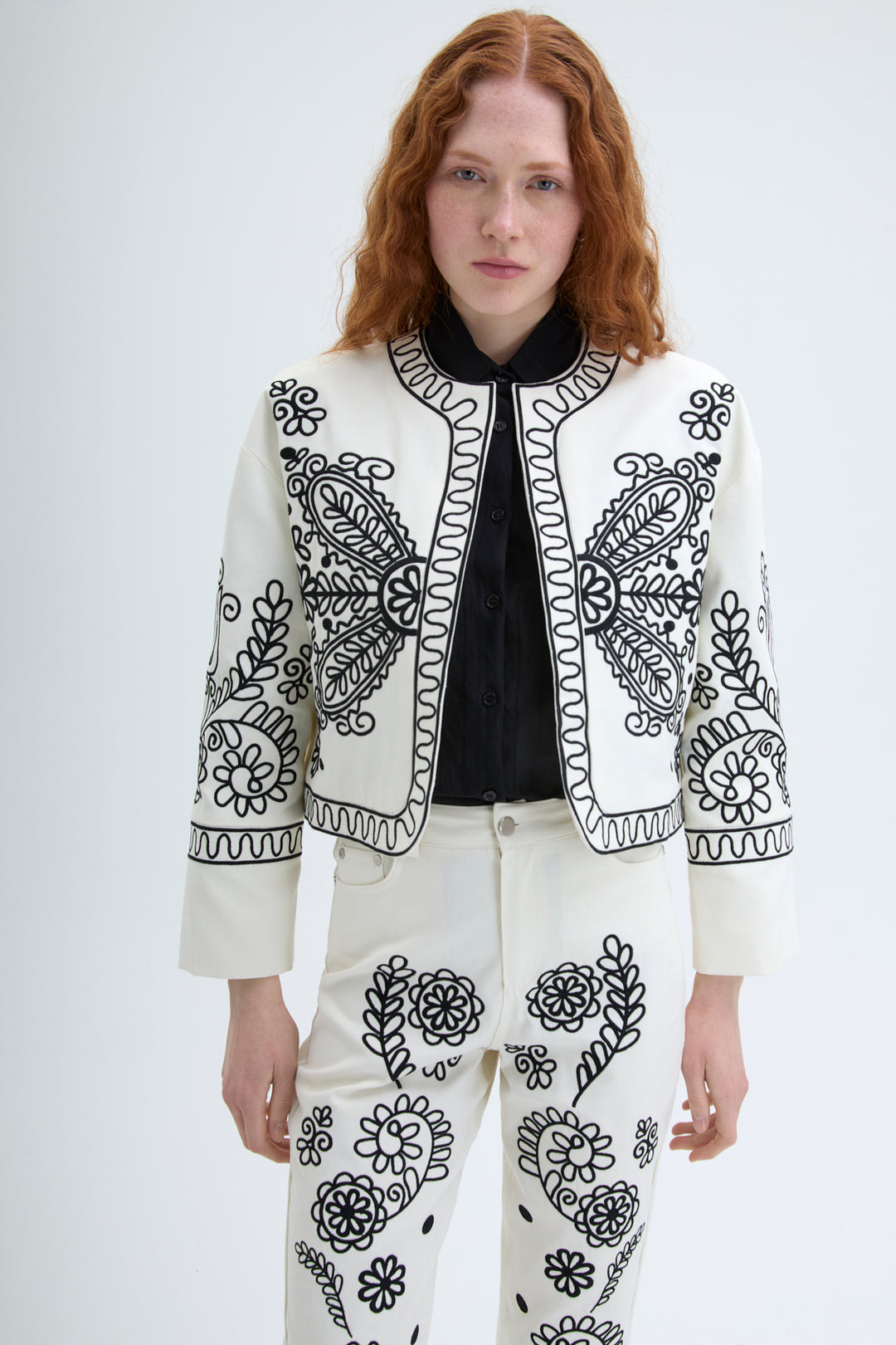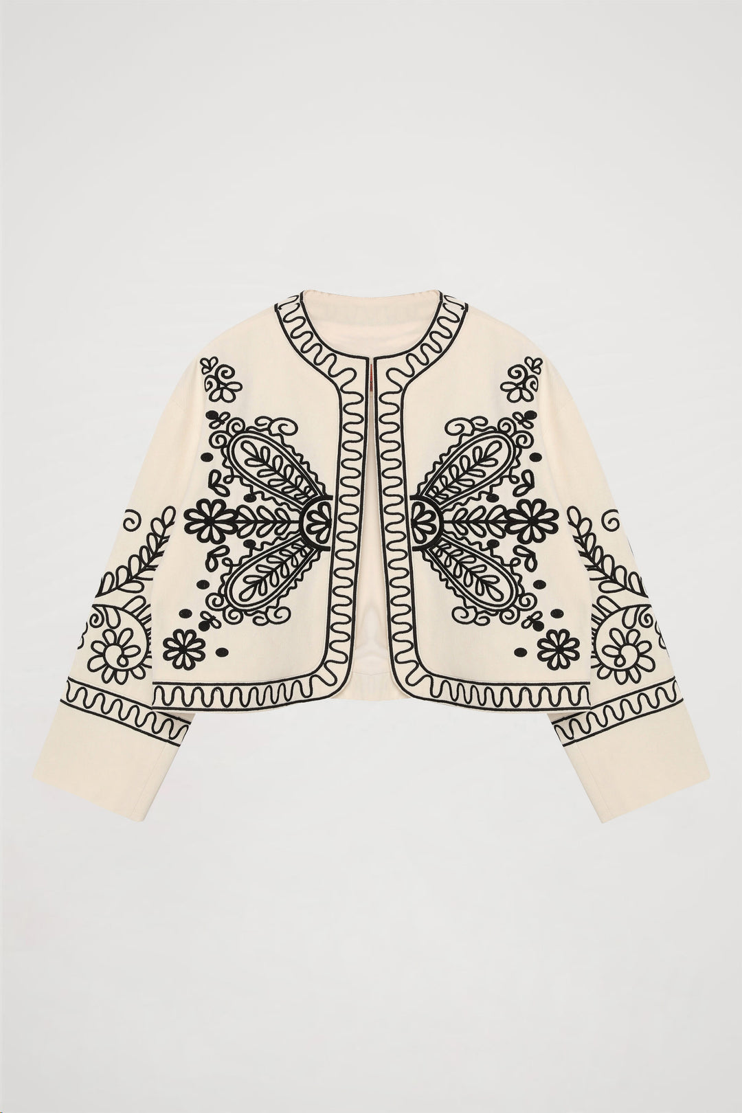 İçi kendi renginden astarlı, yuvarlak yakalı, uzun kollu, nakış işleme detaylı, modern ve şık görünümlü kısa boy ceket.