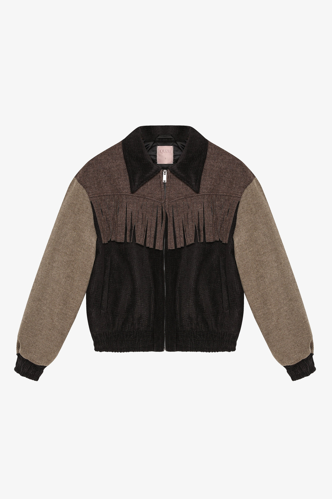 İçi kendi renginden astarlı, önü fermuarlı, püsküllü, uzun kollu, ekose ve kadife match detaylı, yandan cepli ceket.