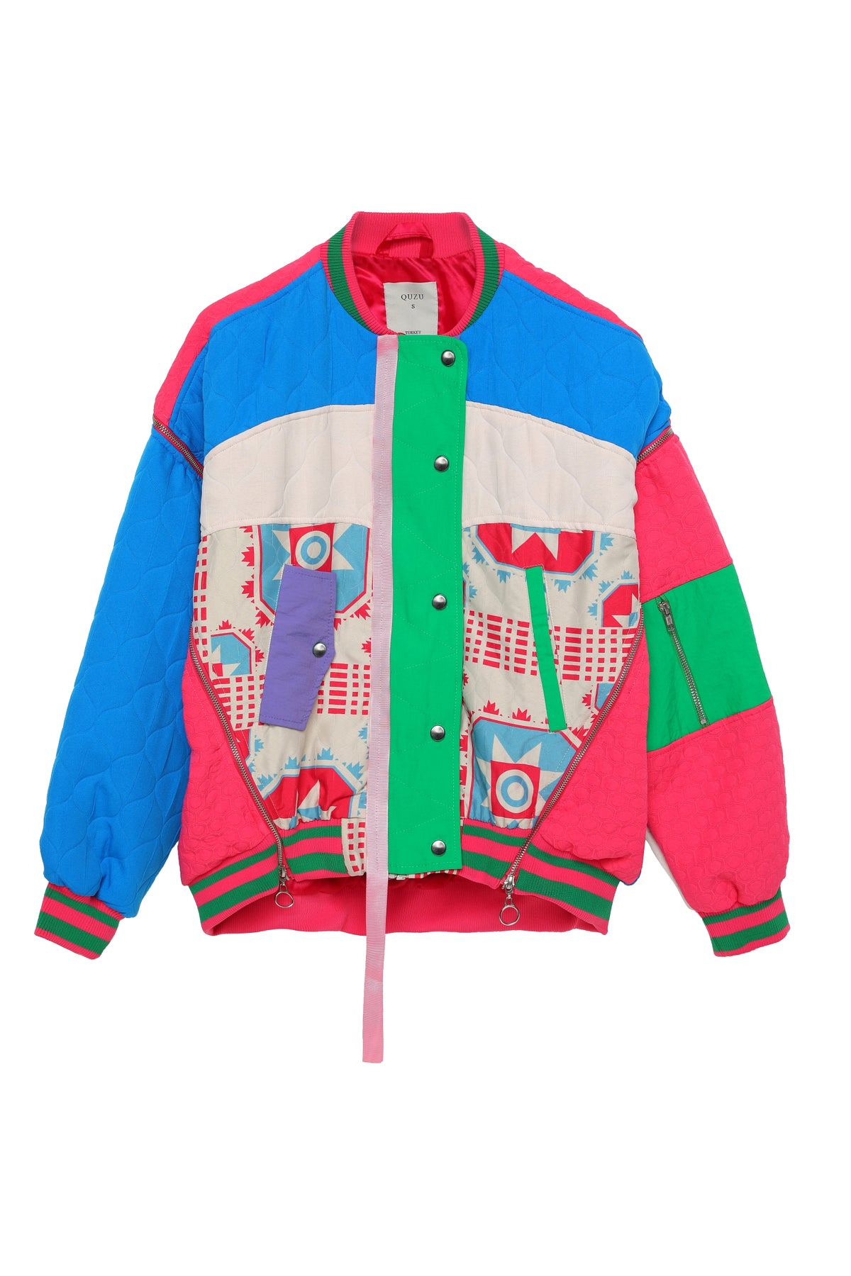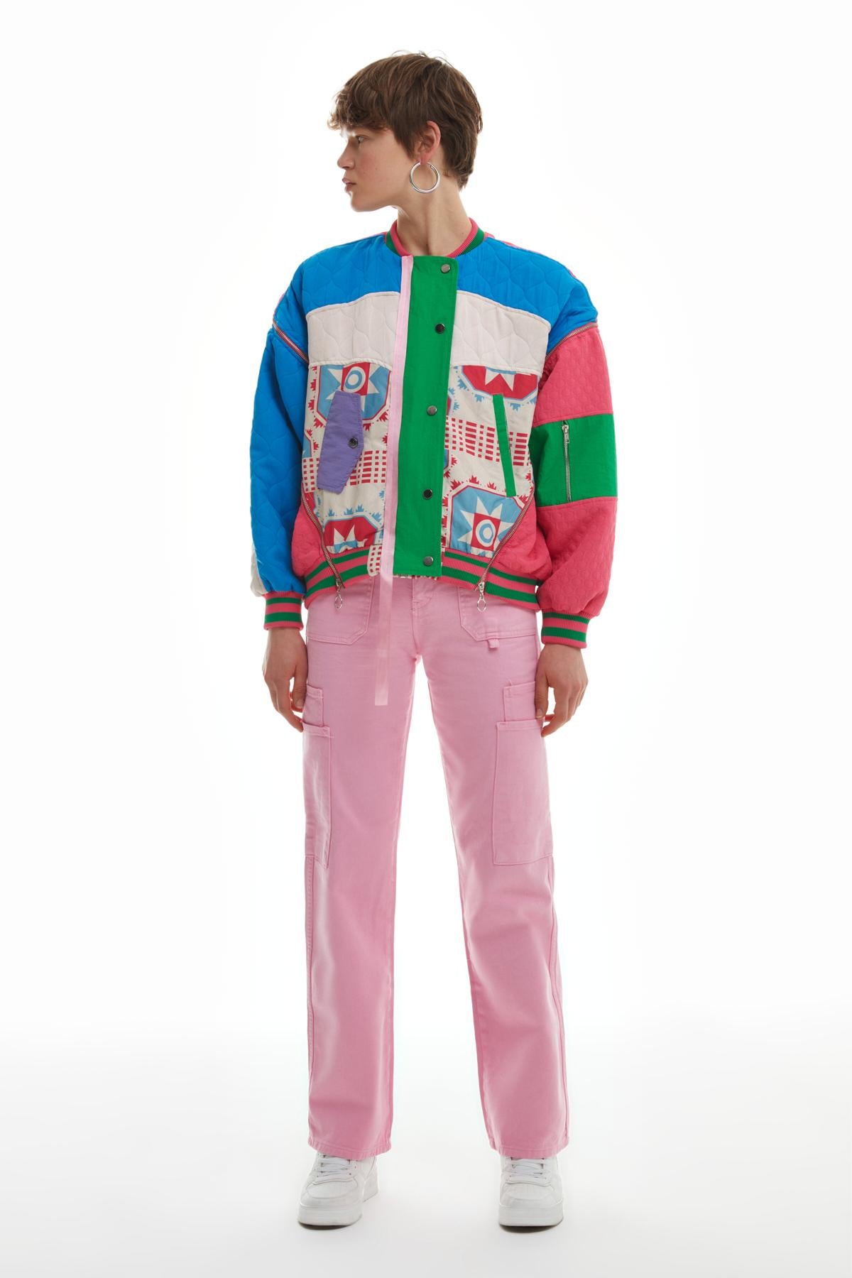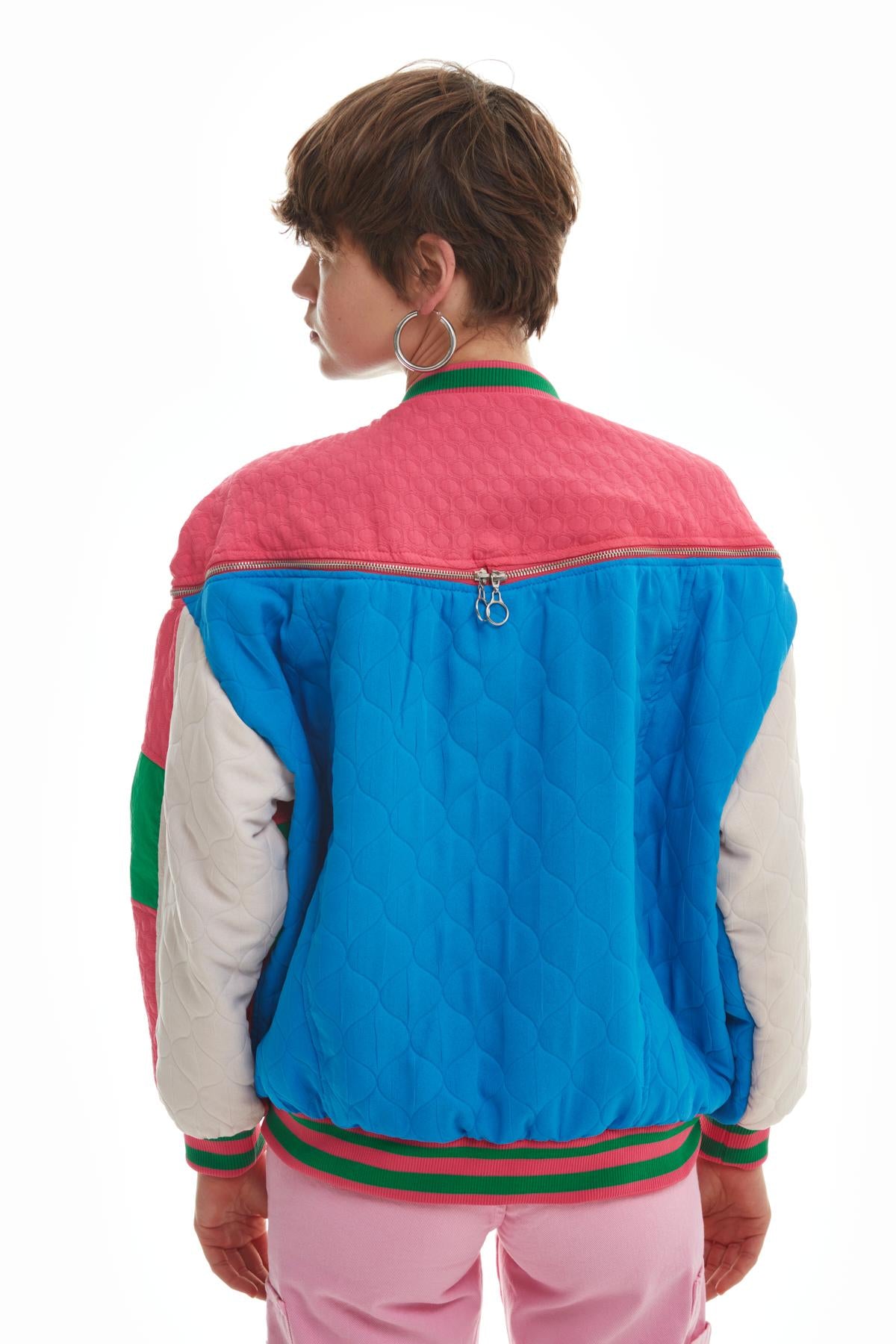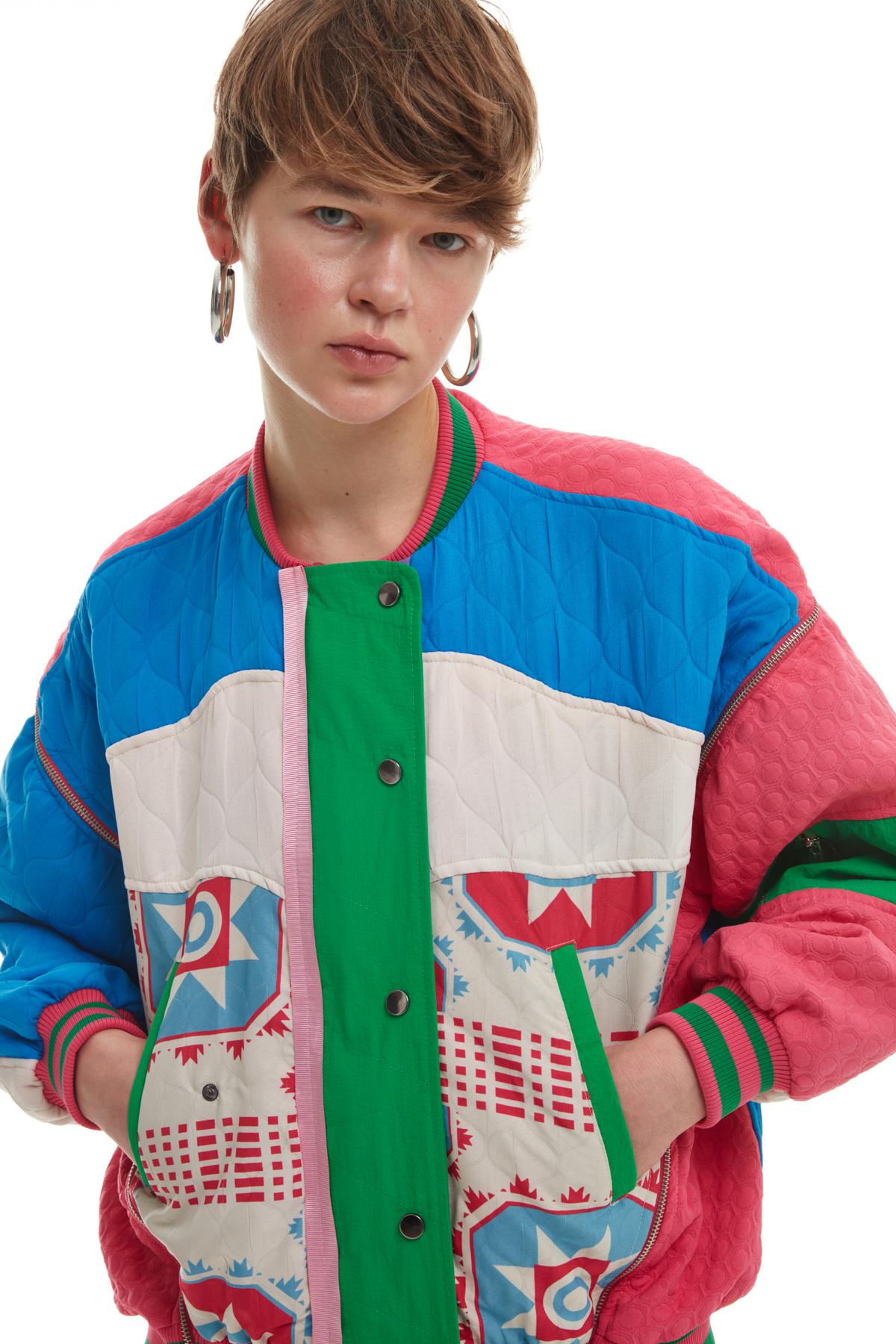 Hakİm yaka, çıtçıt düğmelİ, gİzlİ metalİk fermuarlı, uzun kollu, oversİze kesİm, ceplİ, astarlı, sırt kısmından öne doğru gelen fermuar detayı, çok renklİ, mevsİmlİk kapİtone ceket.