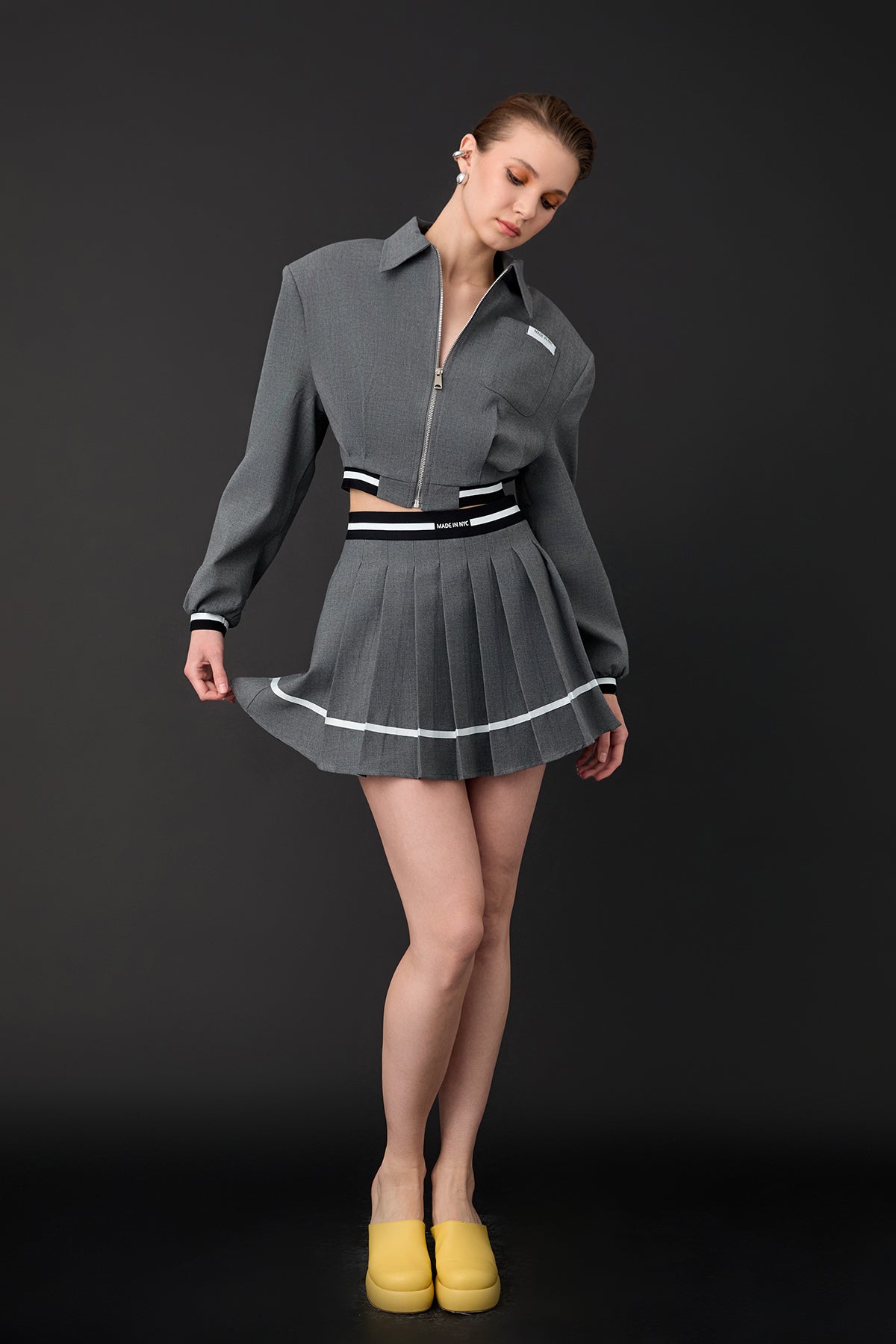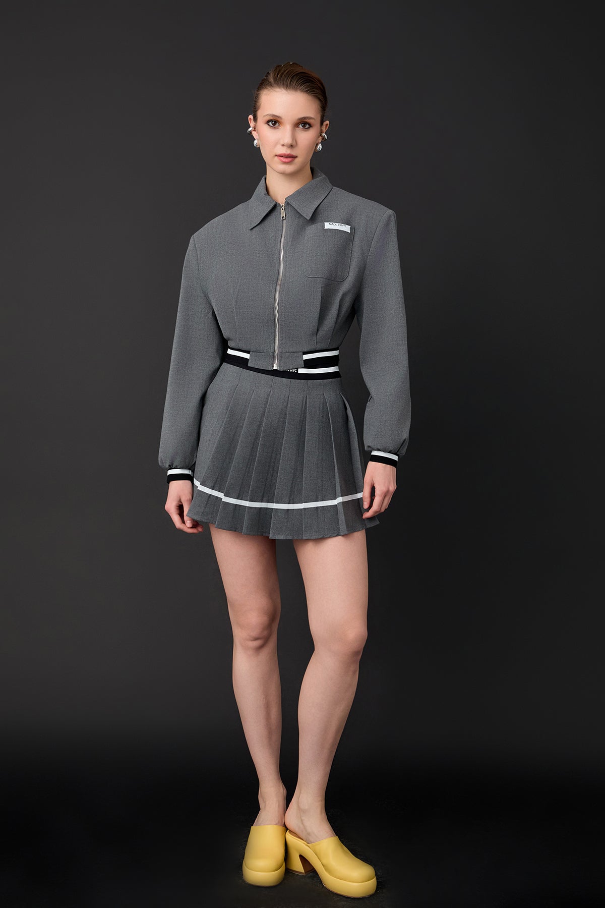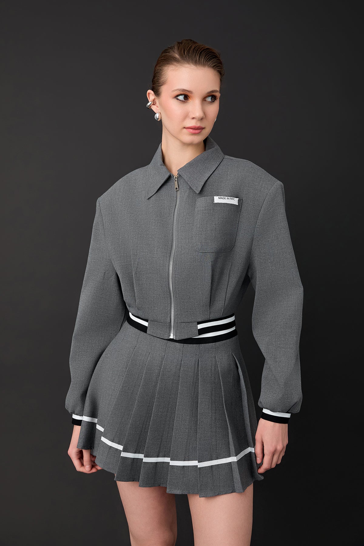 Önden fermuarlı, uzun kollu, ribana detaylı, cep detaylı, kısa ceket.