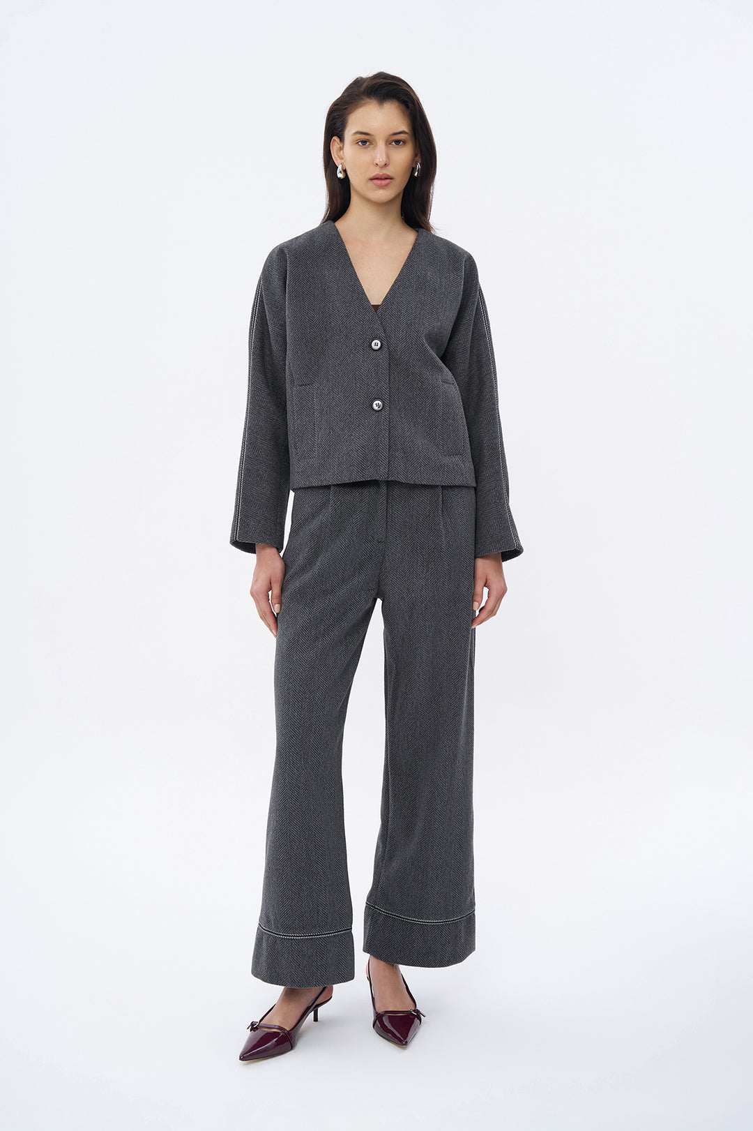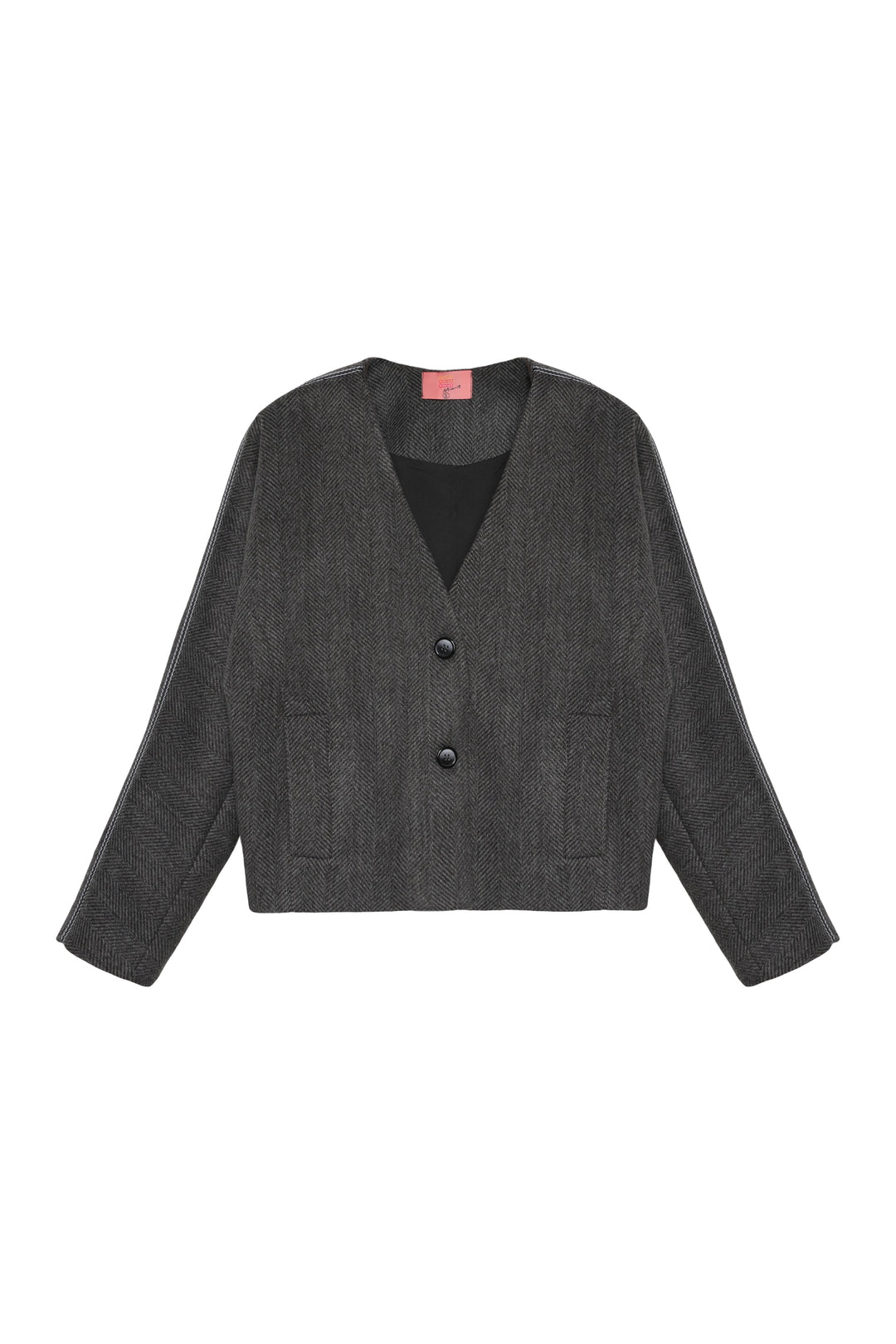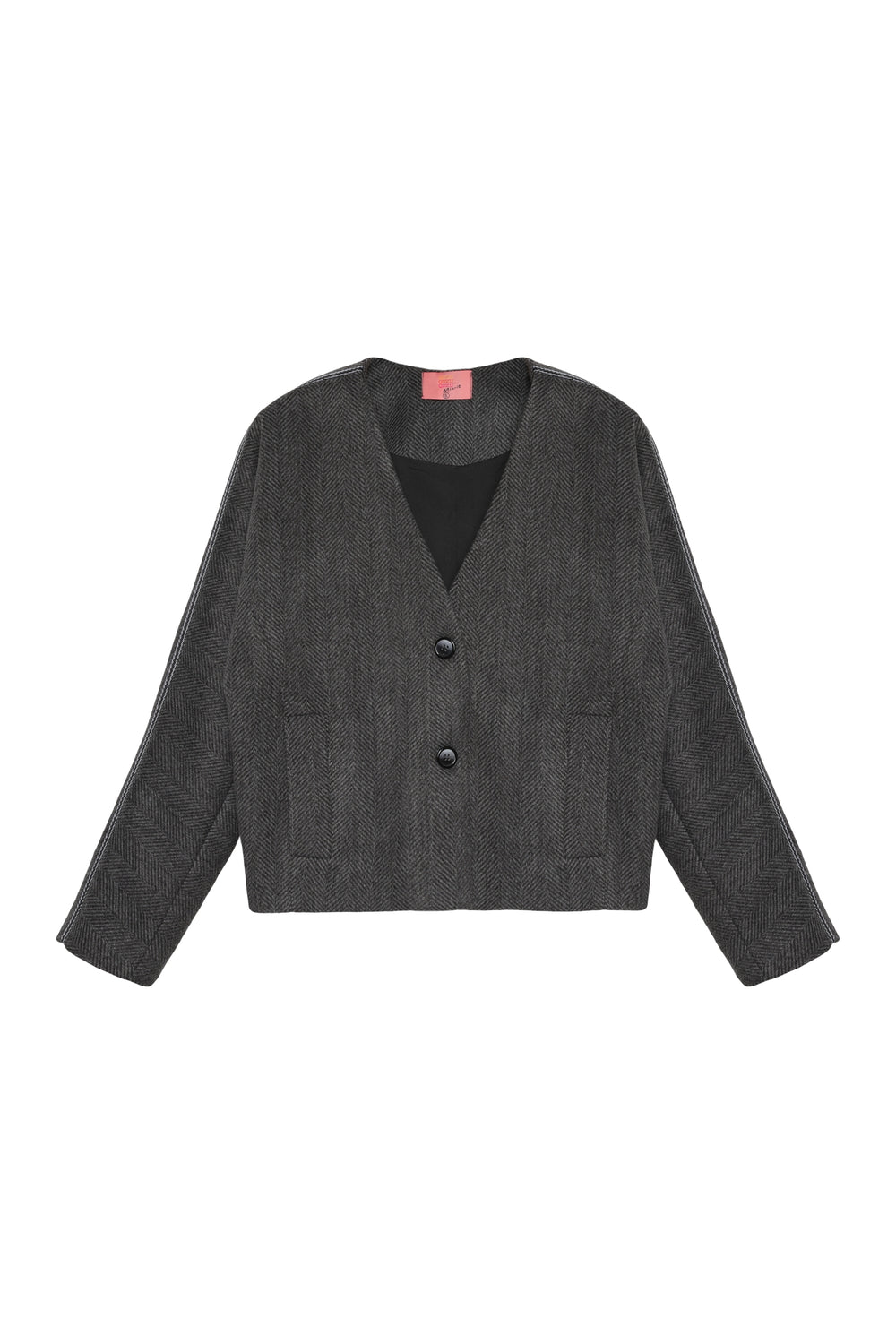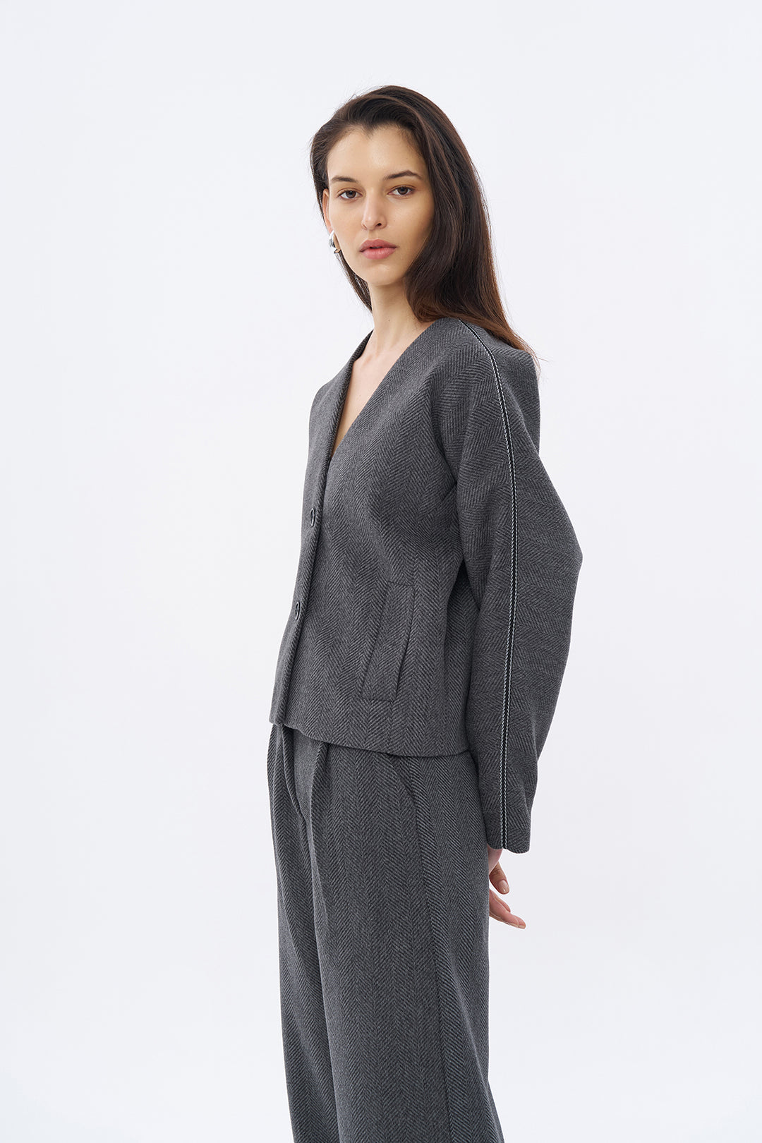 İçi astarlı, v yaka, kolu şerit detaylı, uzun kollu, düğmeli, kaşe ceket.