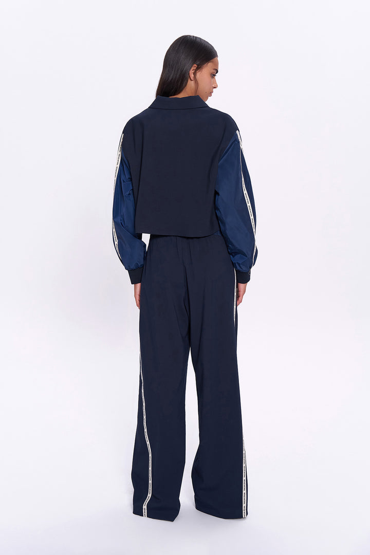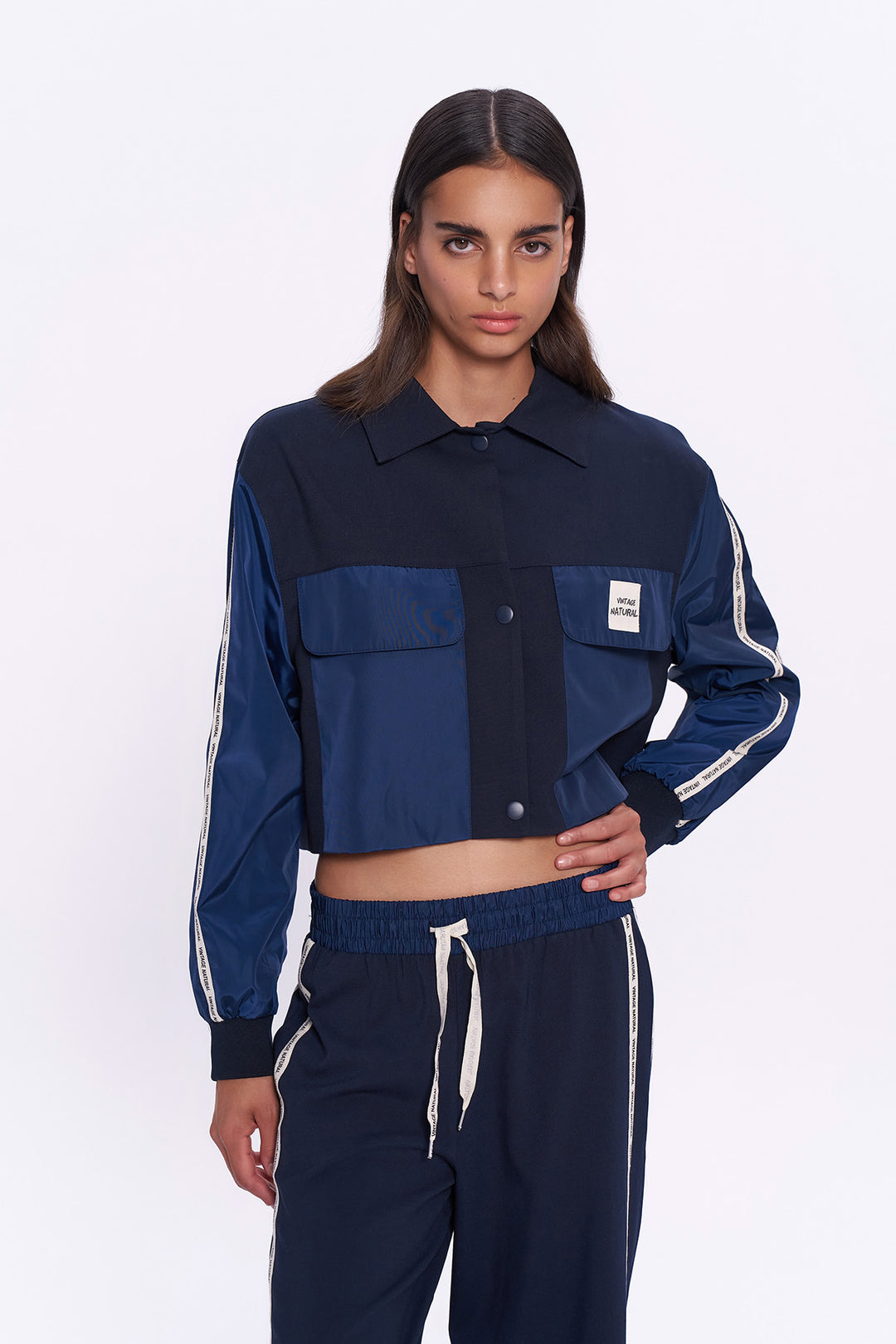 Teknik kumaş detaylı, uzun kol, kolları şerit detayl, kısa ceket.