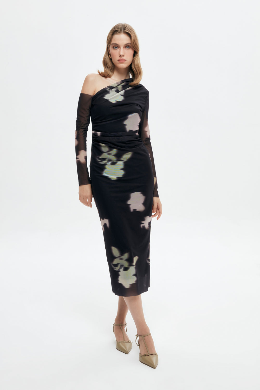 Long dress with asymmetric neckline, long tulle sleeves, drape detail and inner lining.