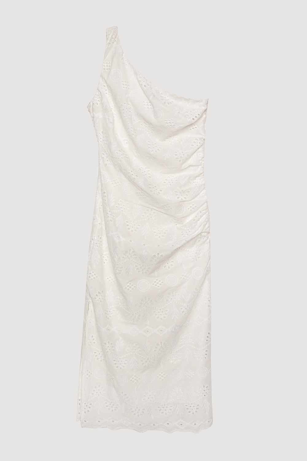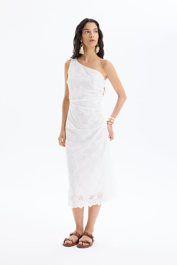 Fisto Detaylı Tek Omuz Midi Elbise Beyaz