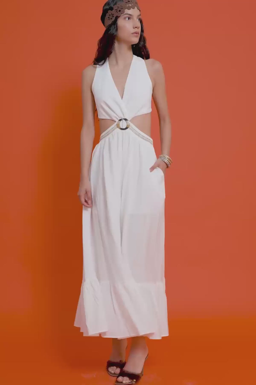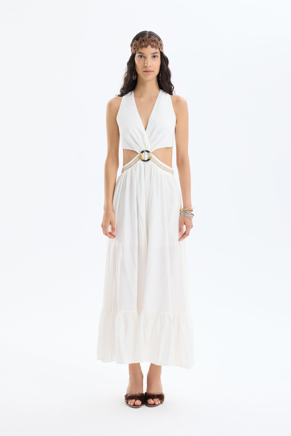 Toka Aksesuarlı Cut Out Midi Boy Elbise Ekru