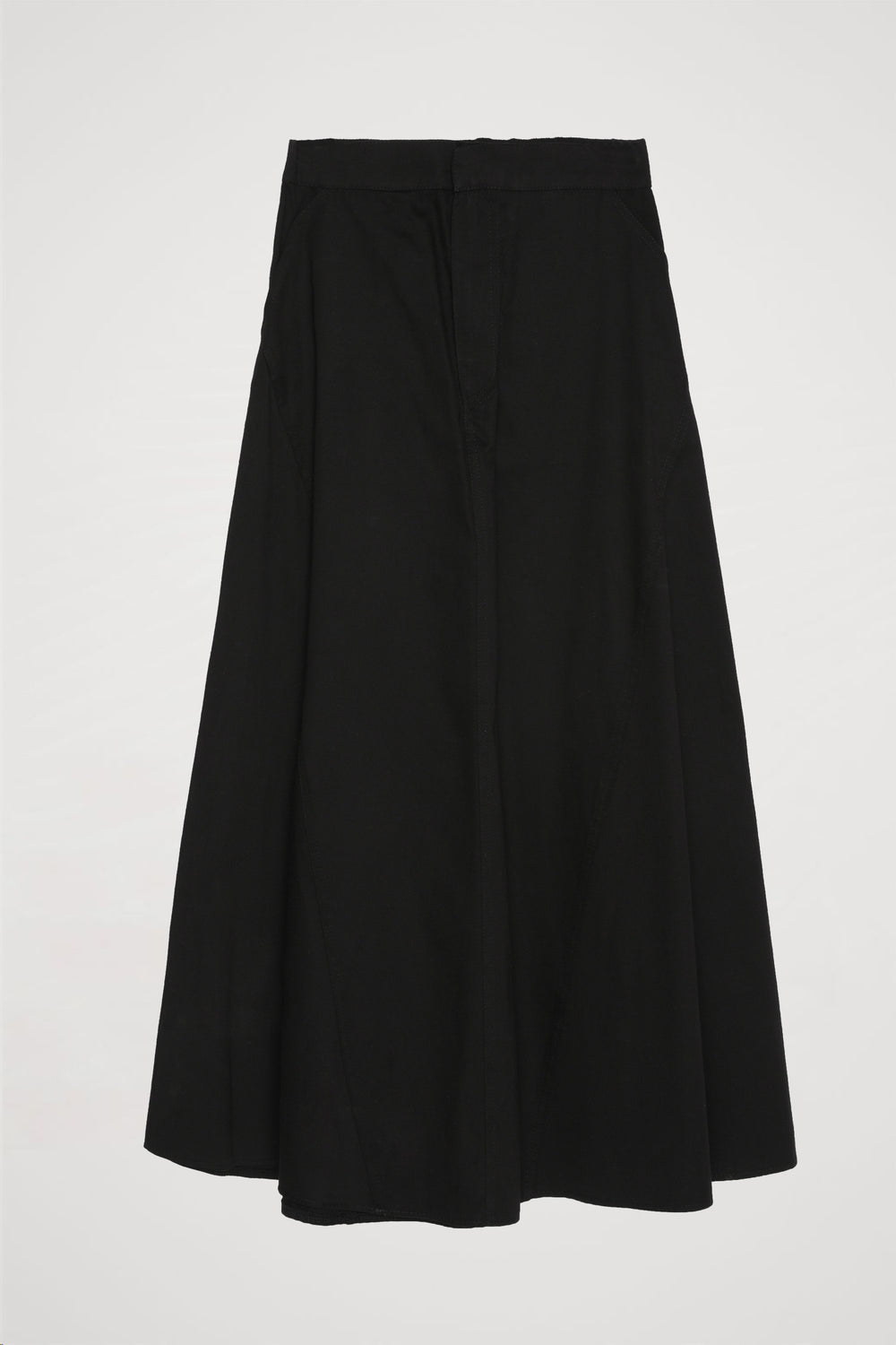Yüksek bel, önden fermuar ve kanca kapamalı, beli lastikli, dikiş detaylı, çift cepli, pileli, A kesim midi etek.