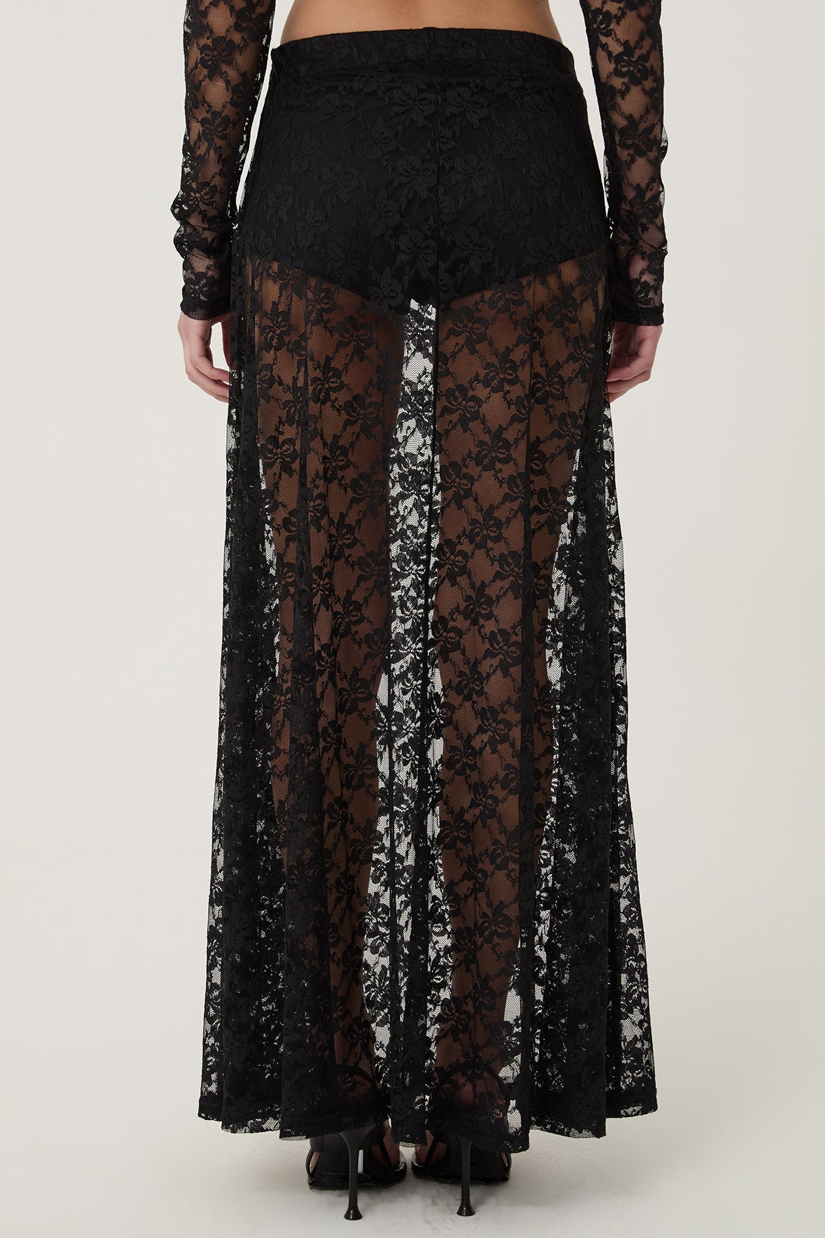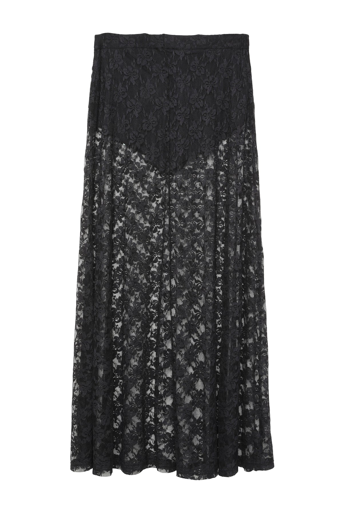 Yüksek bel, uzun, dantel detaylı, transparan etek.