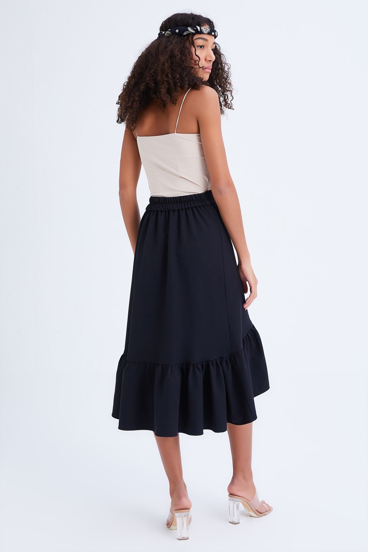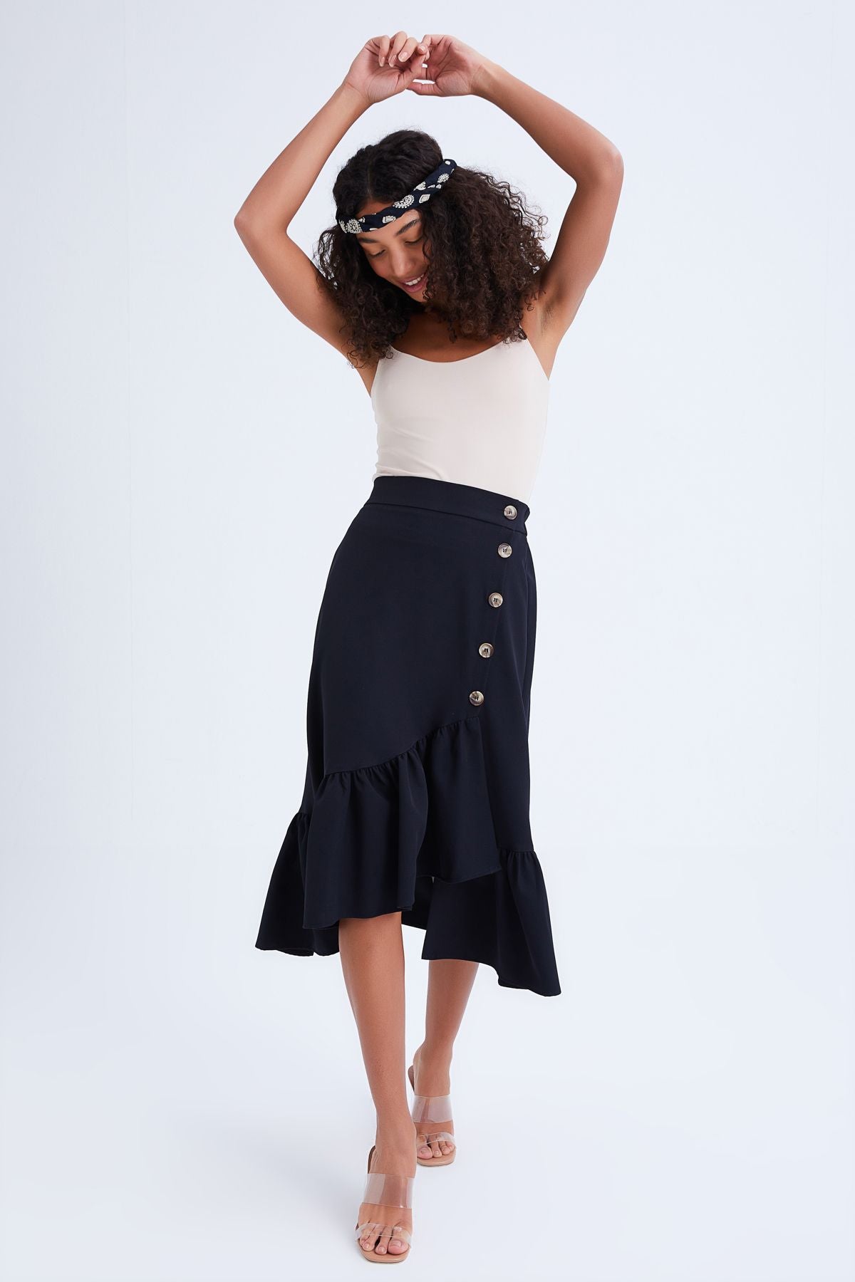 You can use the button-detailed skirt, which gives a different stance with its frilly form, with sandals or with the prominent slipper trends of the season.