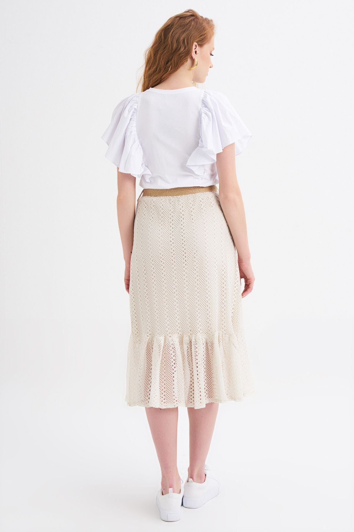 Straw Belt Detailed Guipure Skirt Ecru