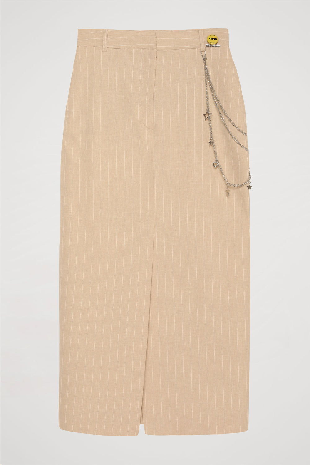 Önden yırtmaçlı, ince çizgi desenli, zincir aksesuar detaylı, yüksek bel, önder fermuar ve kanca kapamalı, midi boy etek.