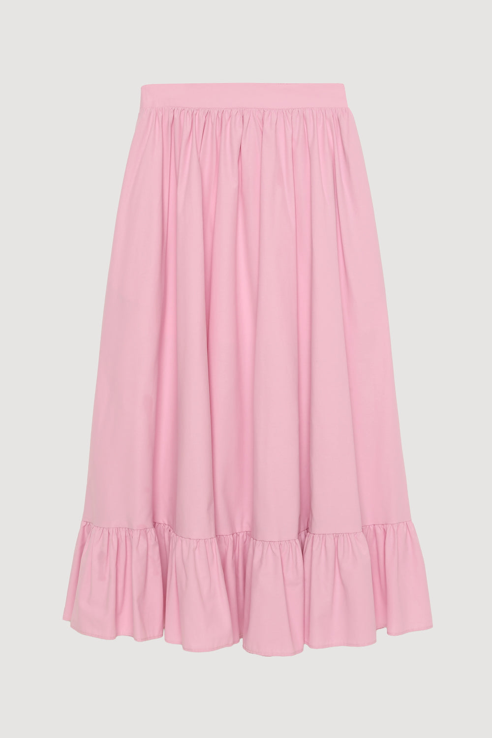 Yüksek bel, büzgü detaylı, alt kısmı volanlı, içi yarım astarlı, yandan fermuar kapamalı, beli lastikli, A kesim, yırtmaçlı midi boy etek.