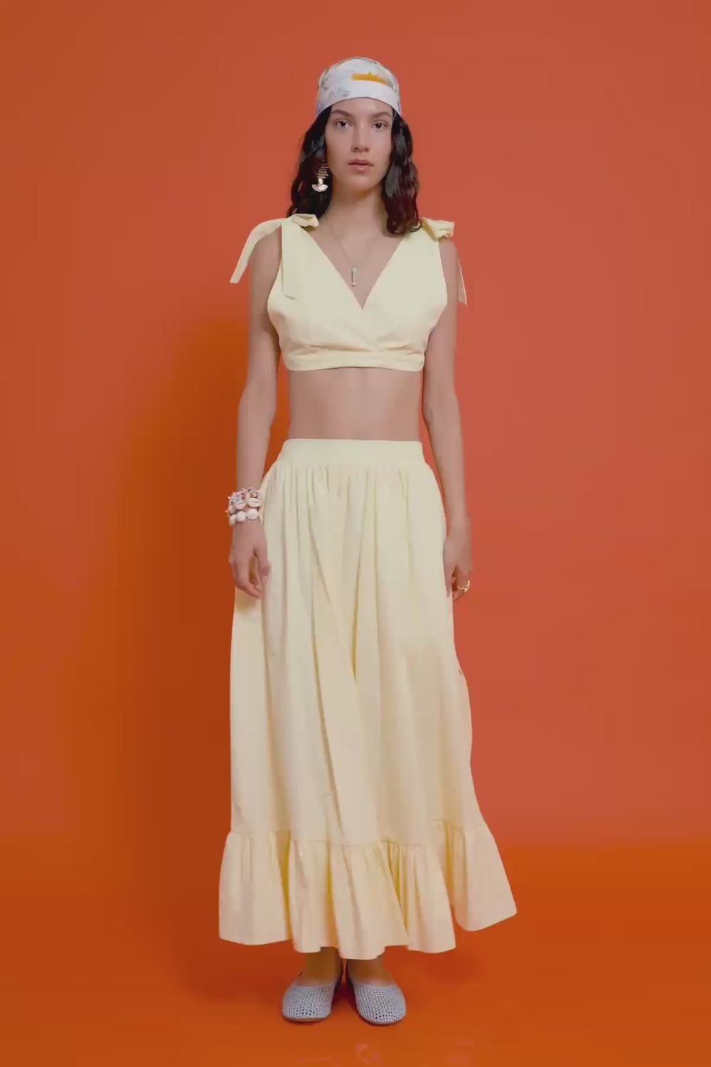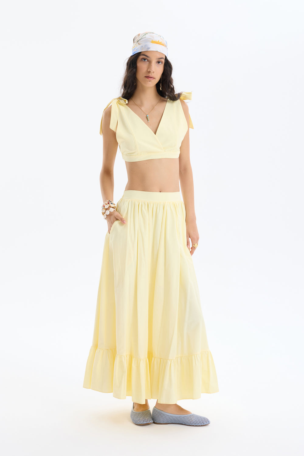 Pile Detaylı Yırtmaçlı Midi Boy Etek Sarı