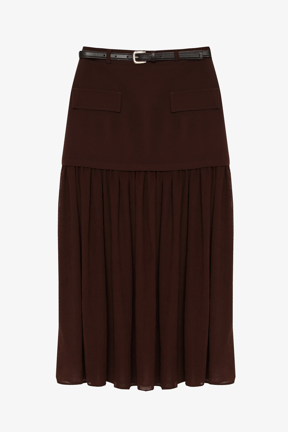 Tül Garnili Kemerli Midi Etek Kahverengi