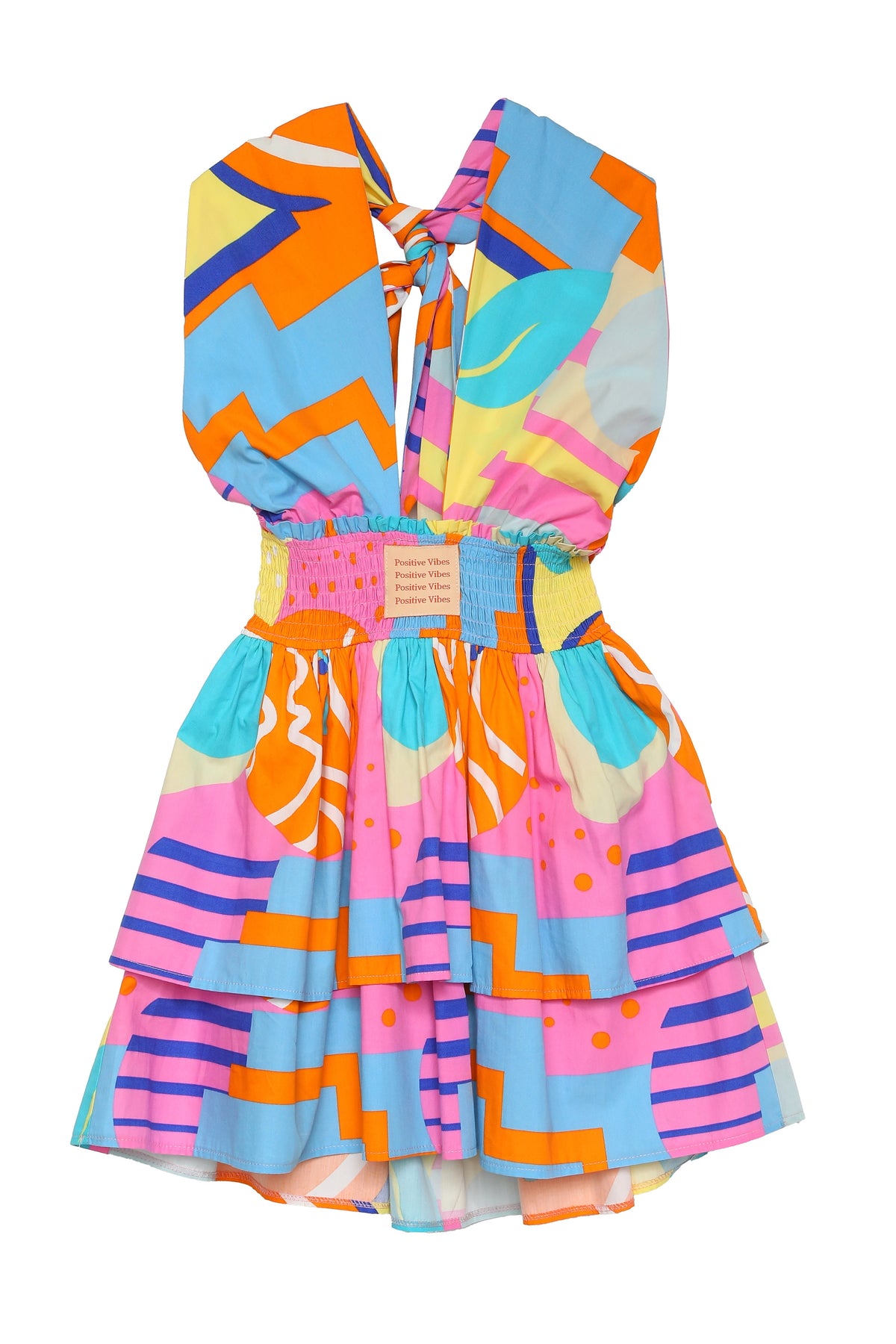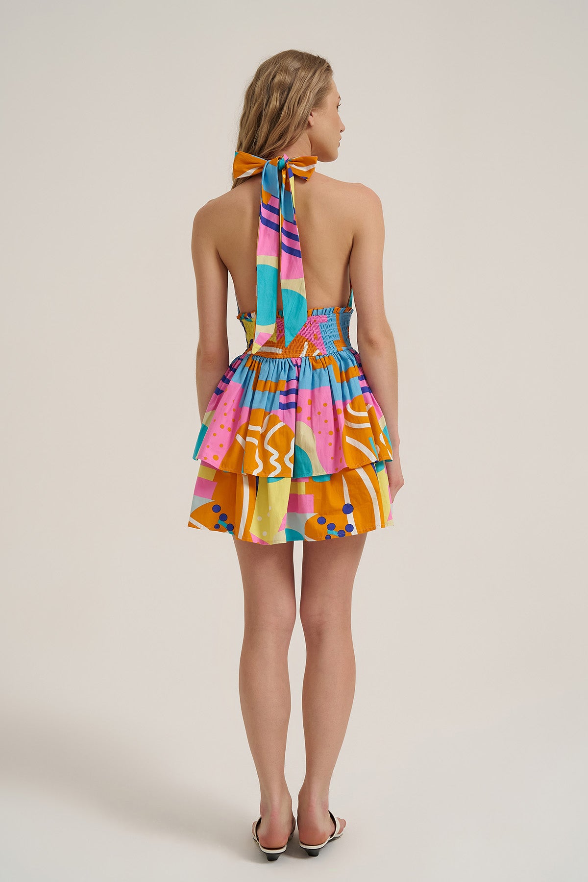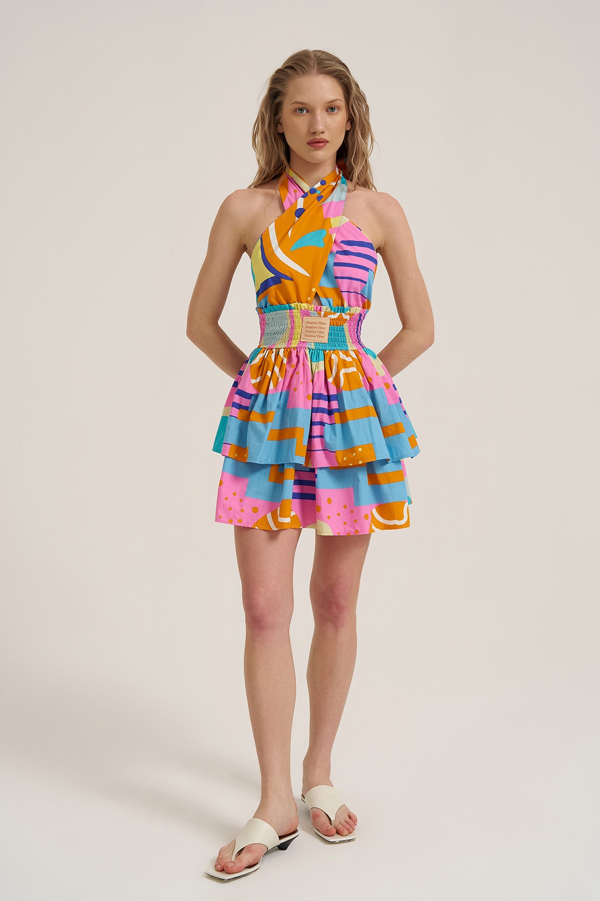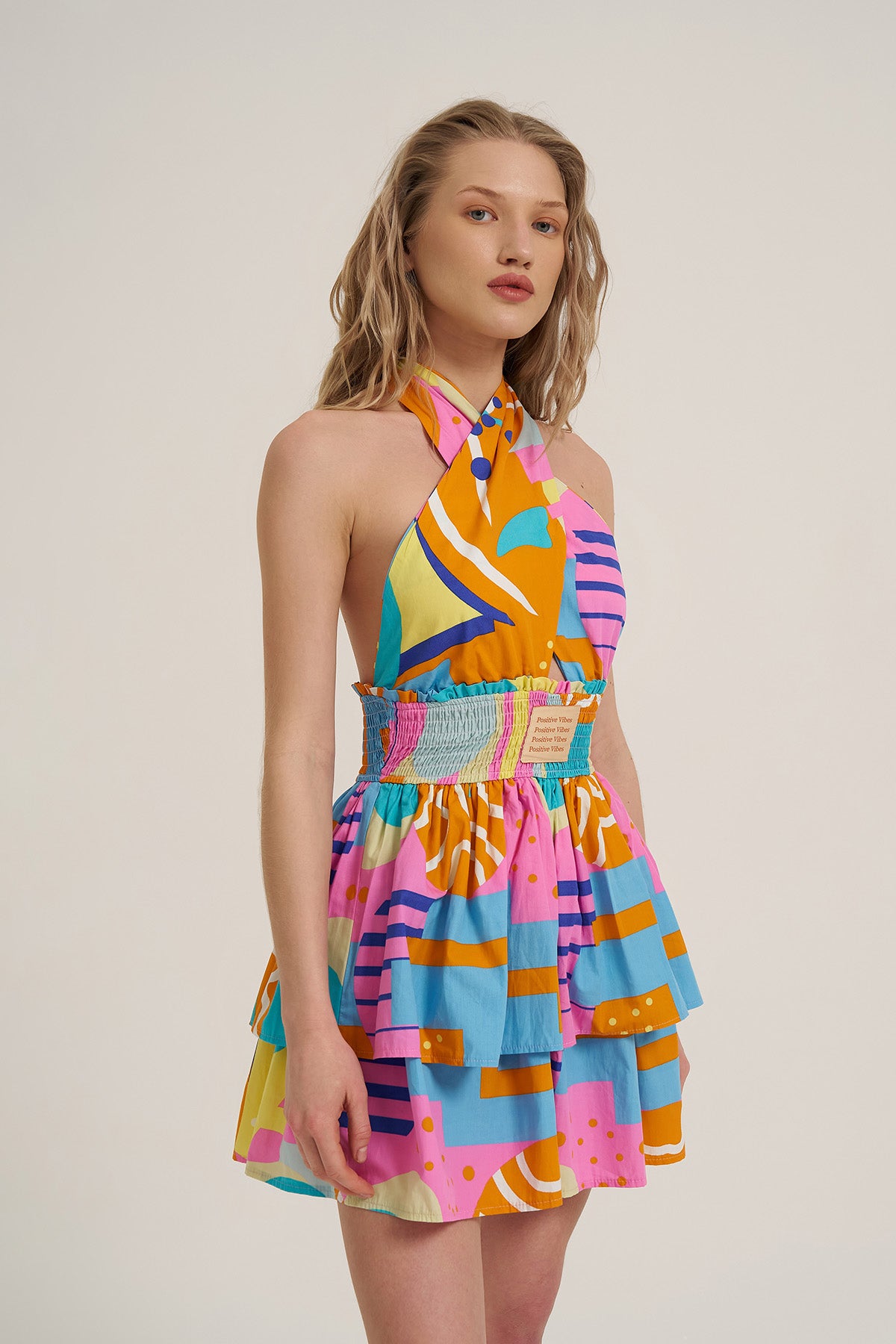 Boyundan bağlamalı, etİket detaylı, belden lastİklİ, renklİ desenlİ mİnİ elbİse.