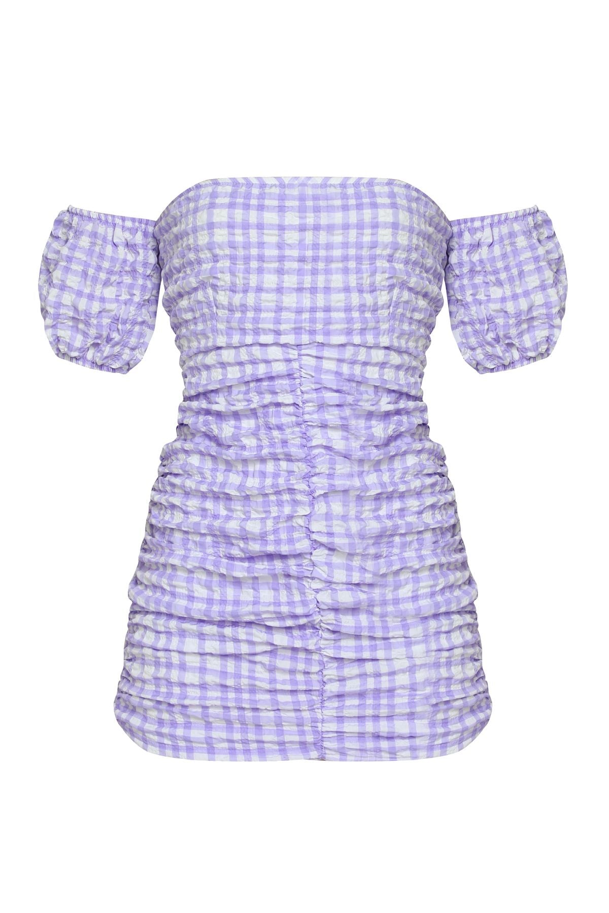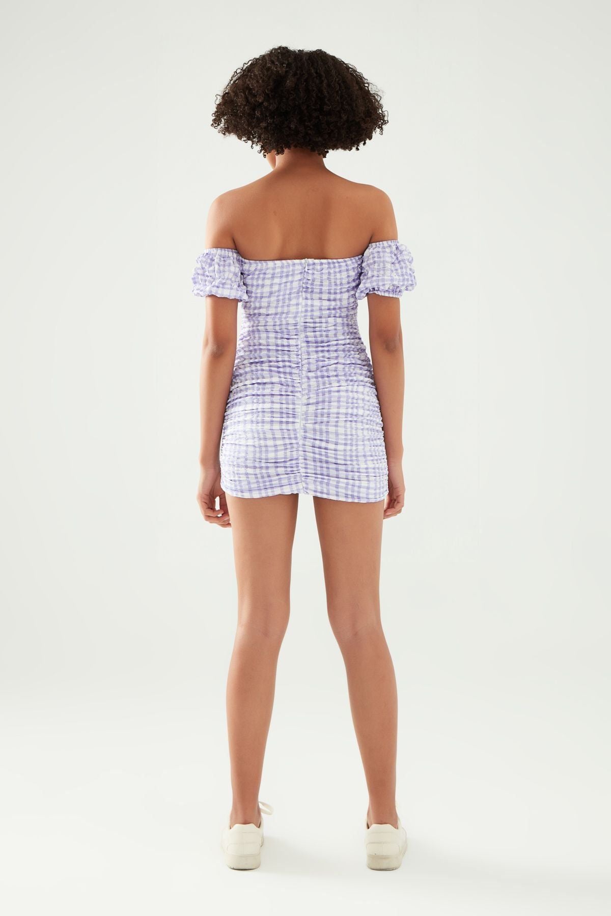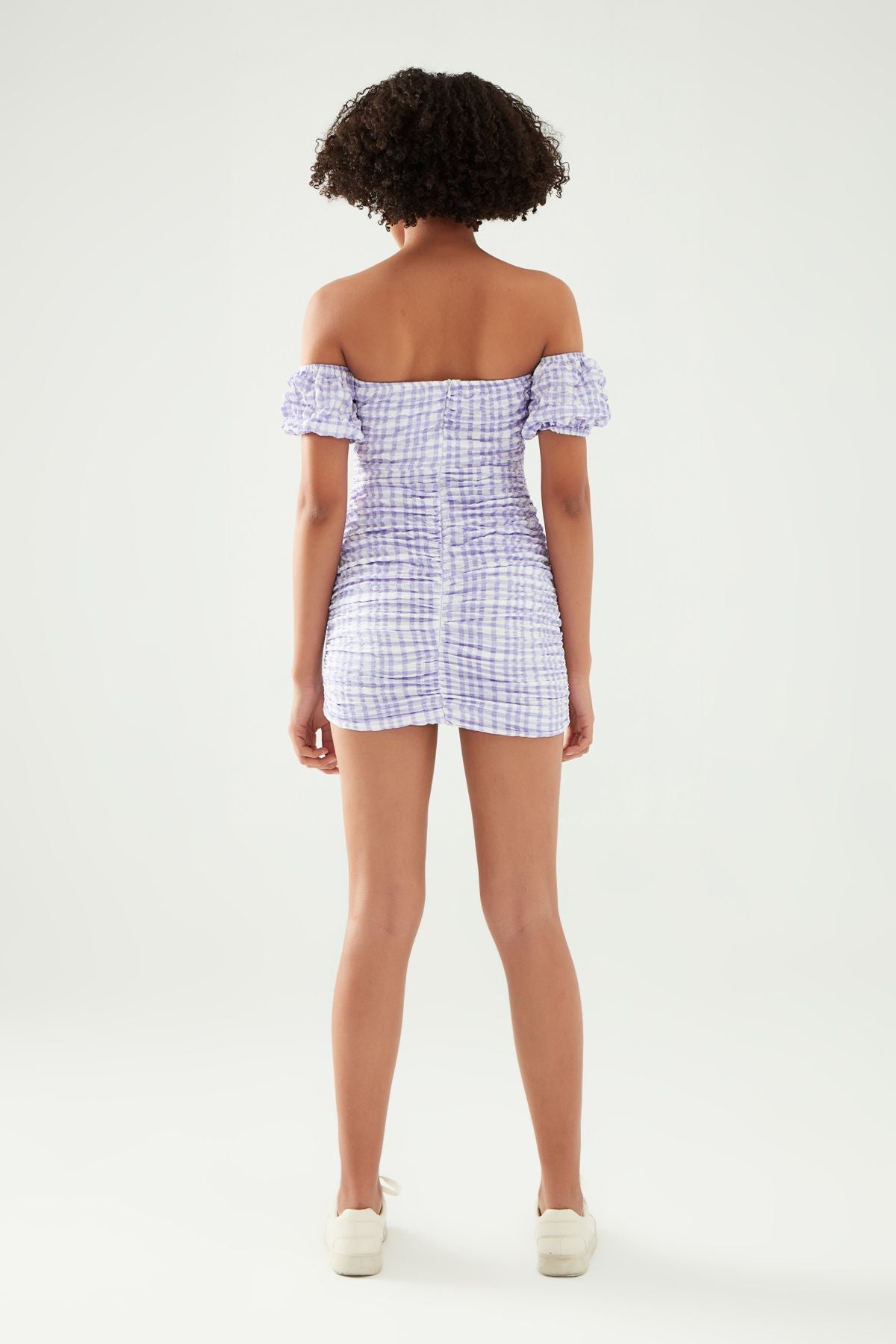 The collar part of the shirred dress with low shoulder detail is straight neck and the cuff part is elastic. The dress is in two parts. The shirring detail becomes more frequent after the under bust part. There is a hidden zipper in the middle of the back.