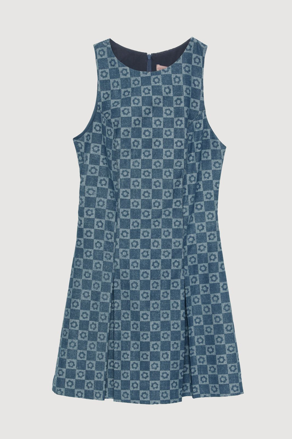 Üst kısmı astarlı, kolsuz, halter yaka, çiçek desenli, denim görünümlü kumaştan, sırtı fermuar kapamalı, etek ucu pileli, mini boy elbise.