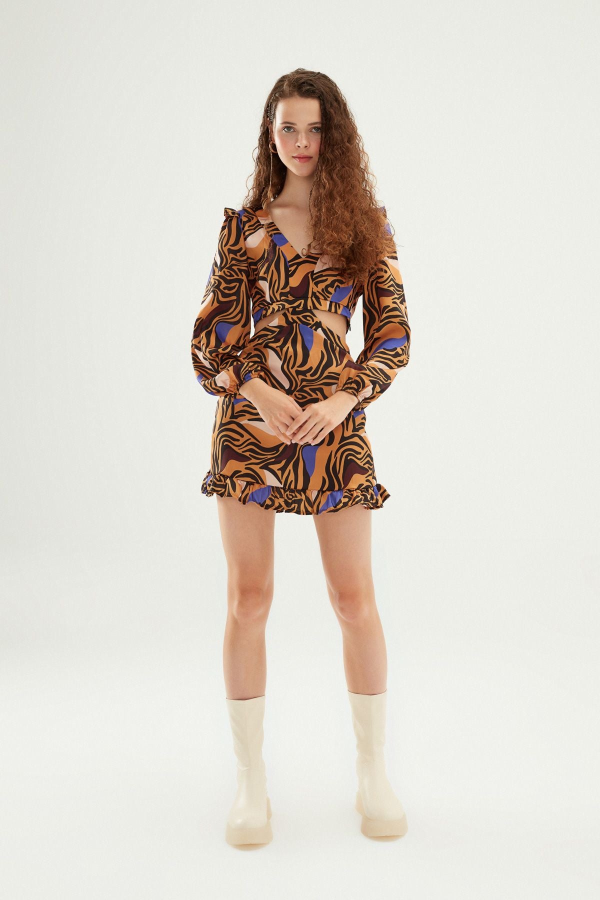 Patterned Cut Out Mini Dress Brown