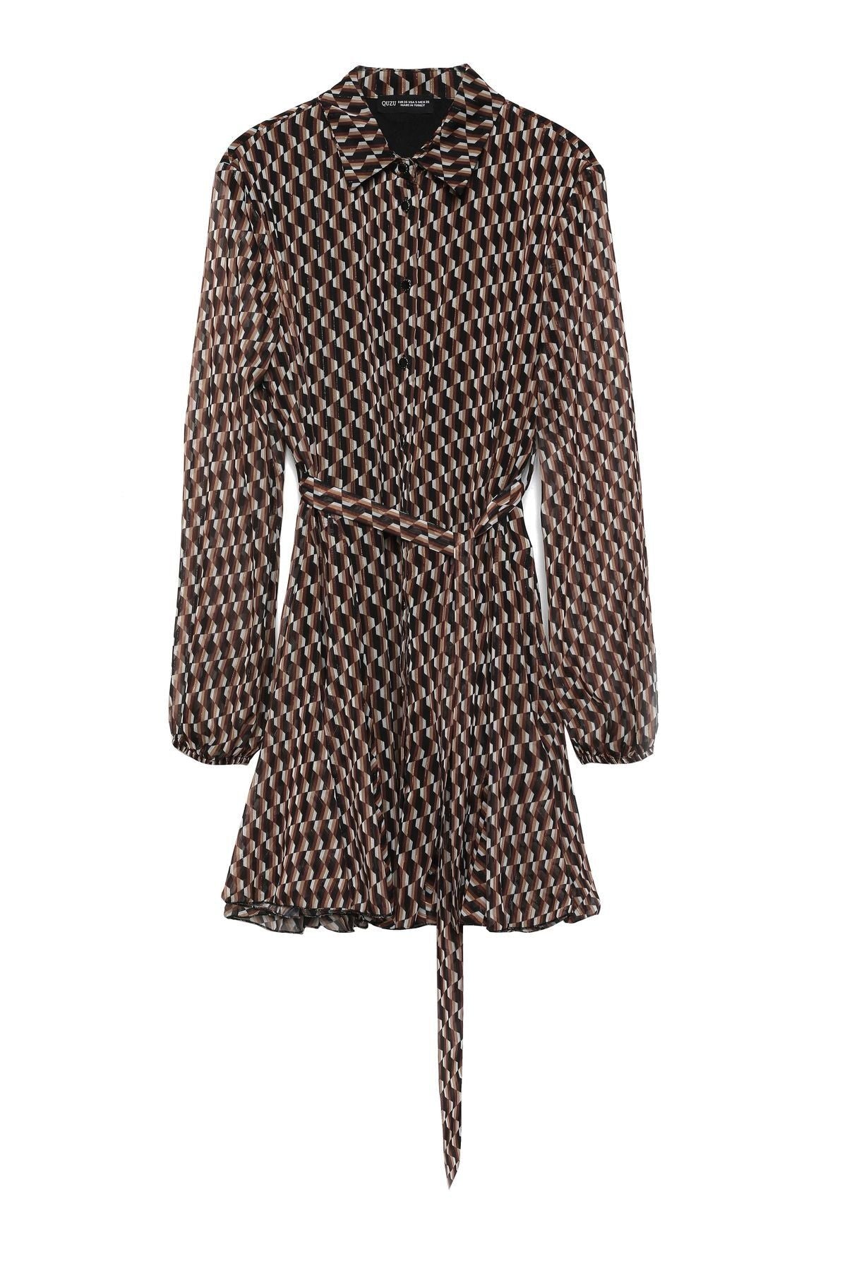 Patterned Button Detailed Mini Dress Brown