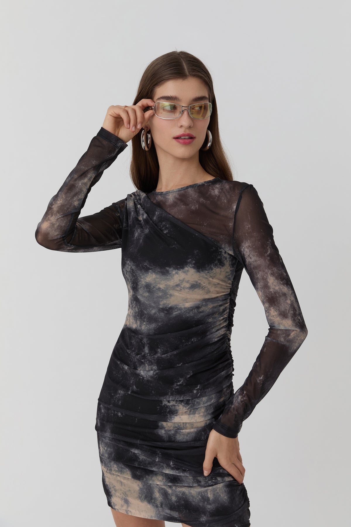 Drape Detaylı Desenli Tül Mini Elbise Siyah