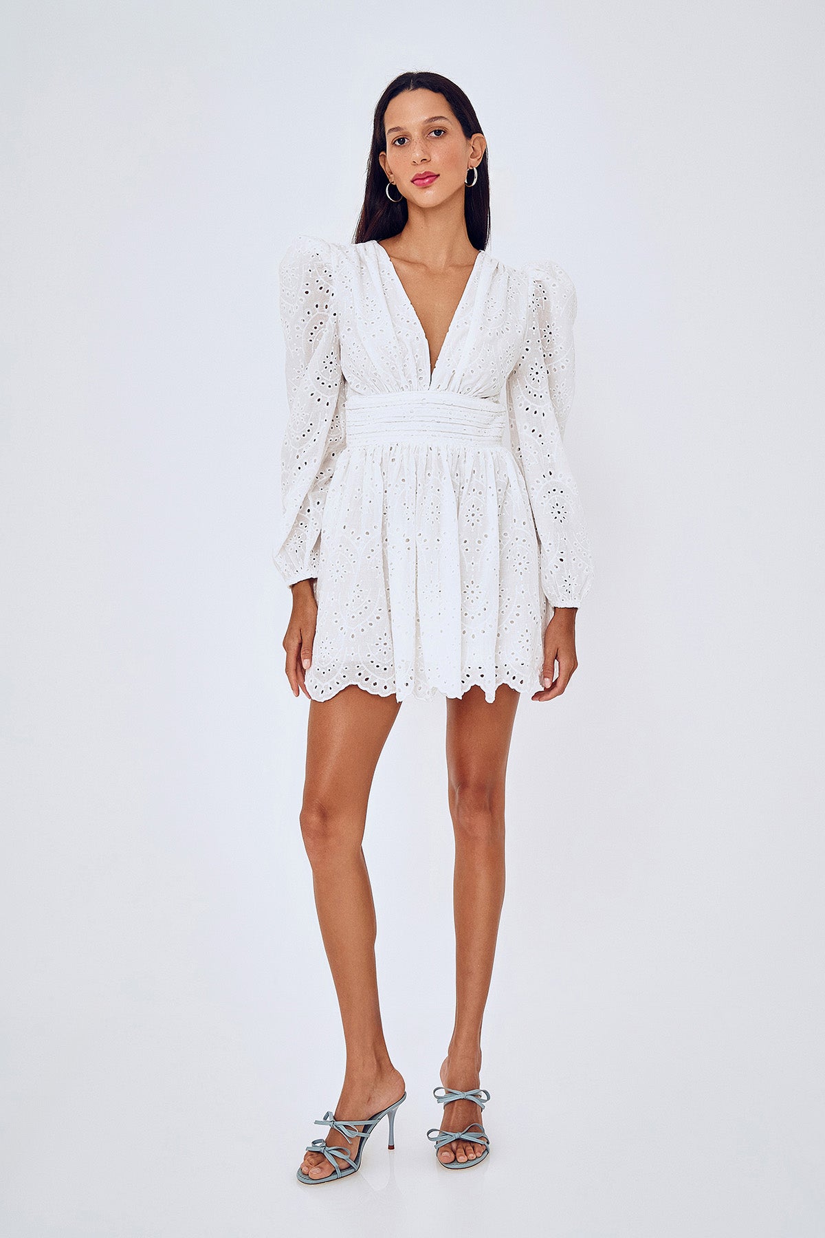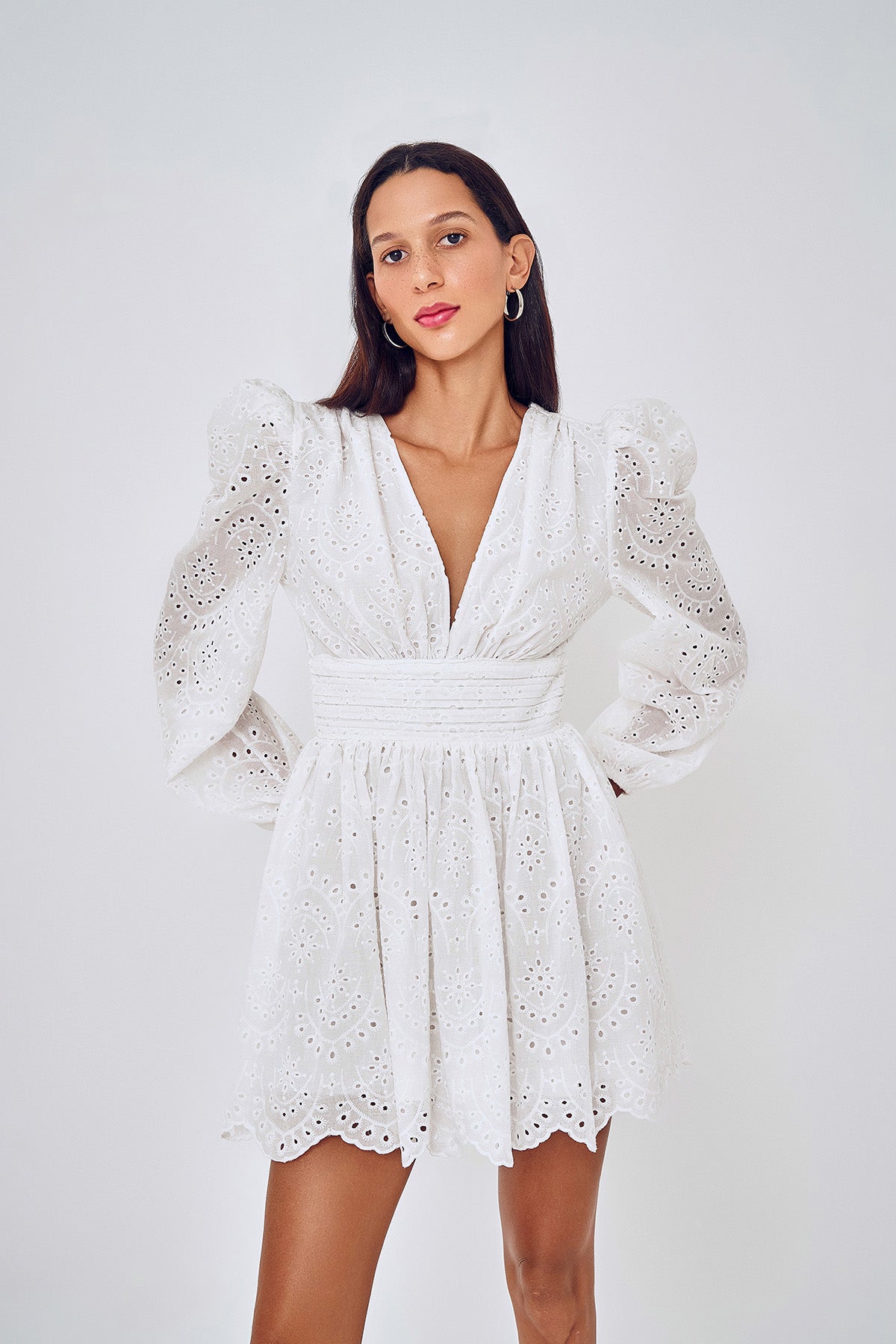 Uzun kollu, sırtı dekolteli, derin V yaka, fisto detaylı, mini boy elbise.