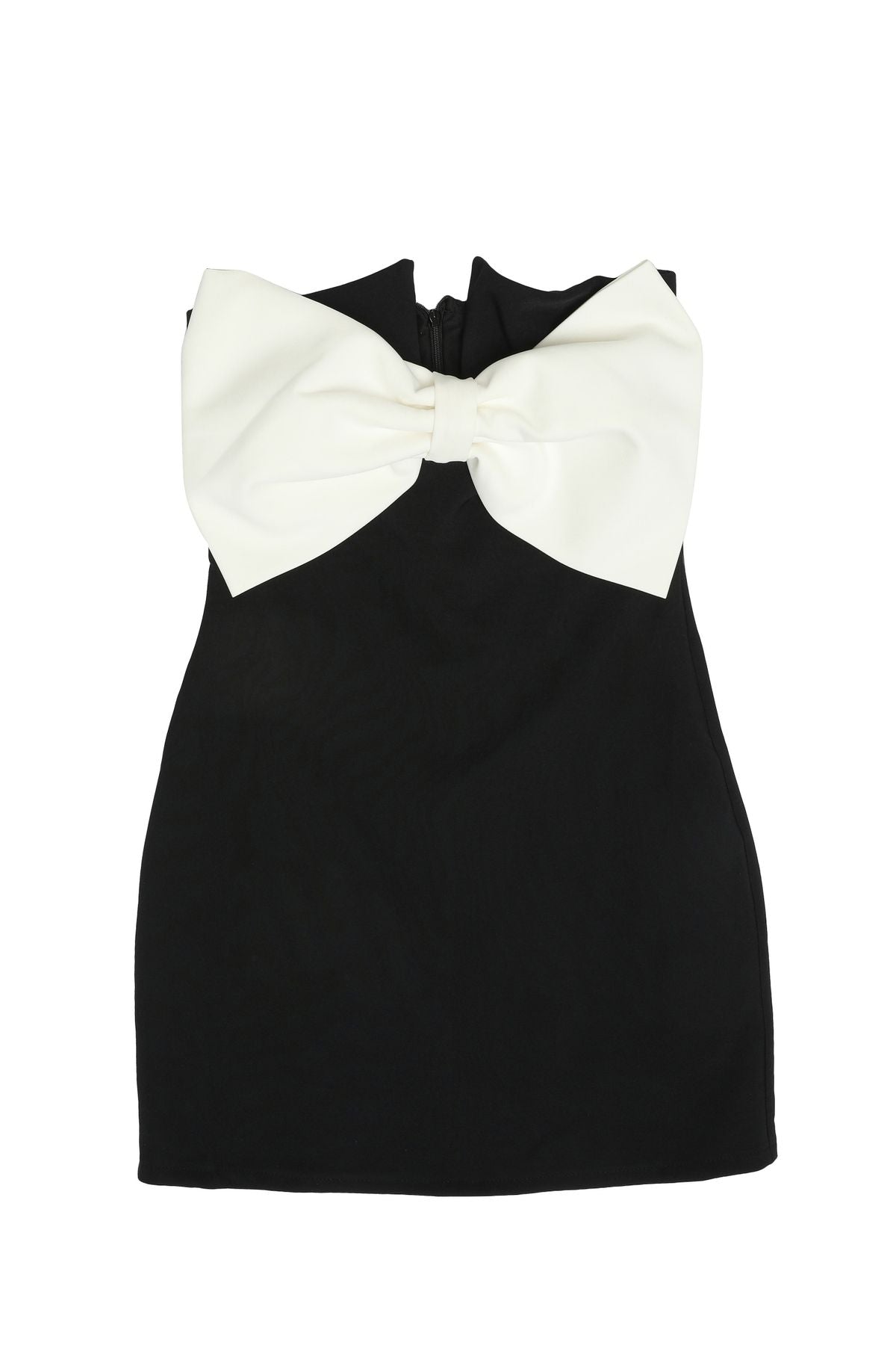 Strapless, mini-length elegant dress with bow detail, inner lining, zip fastening on the back.