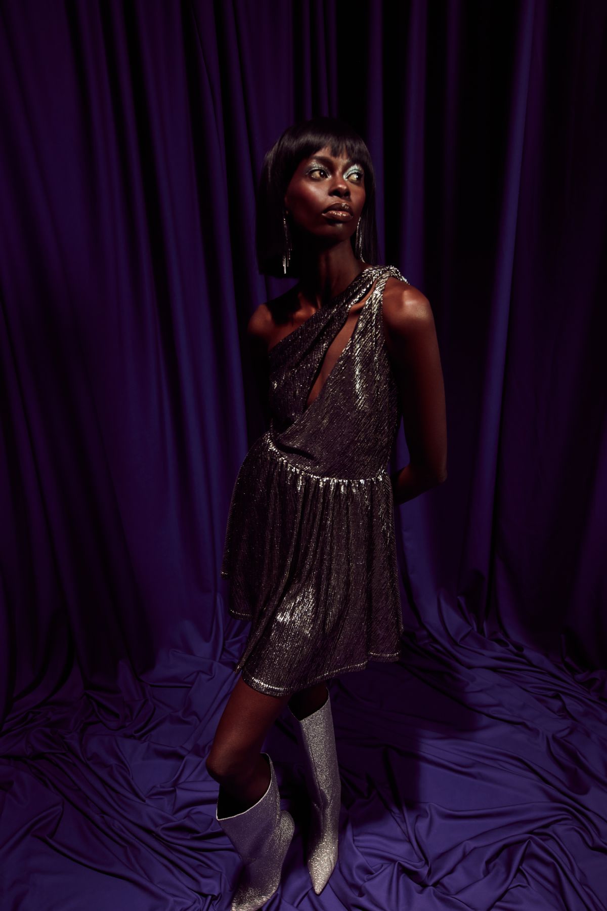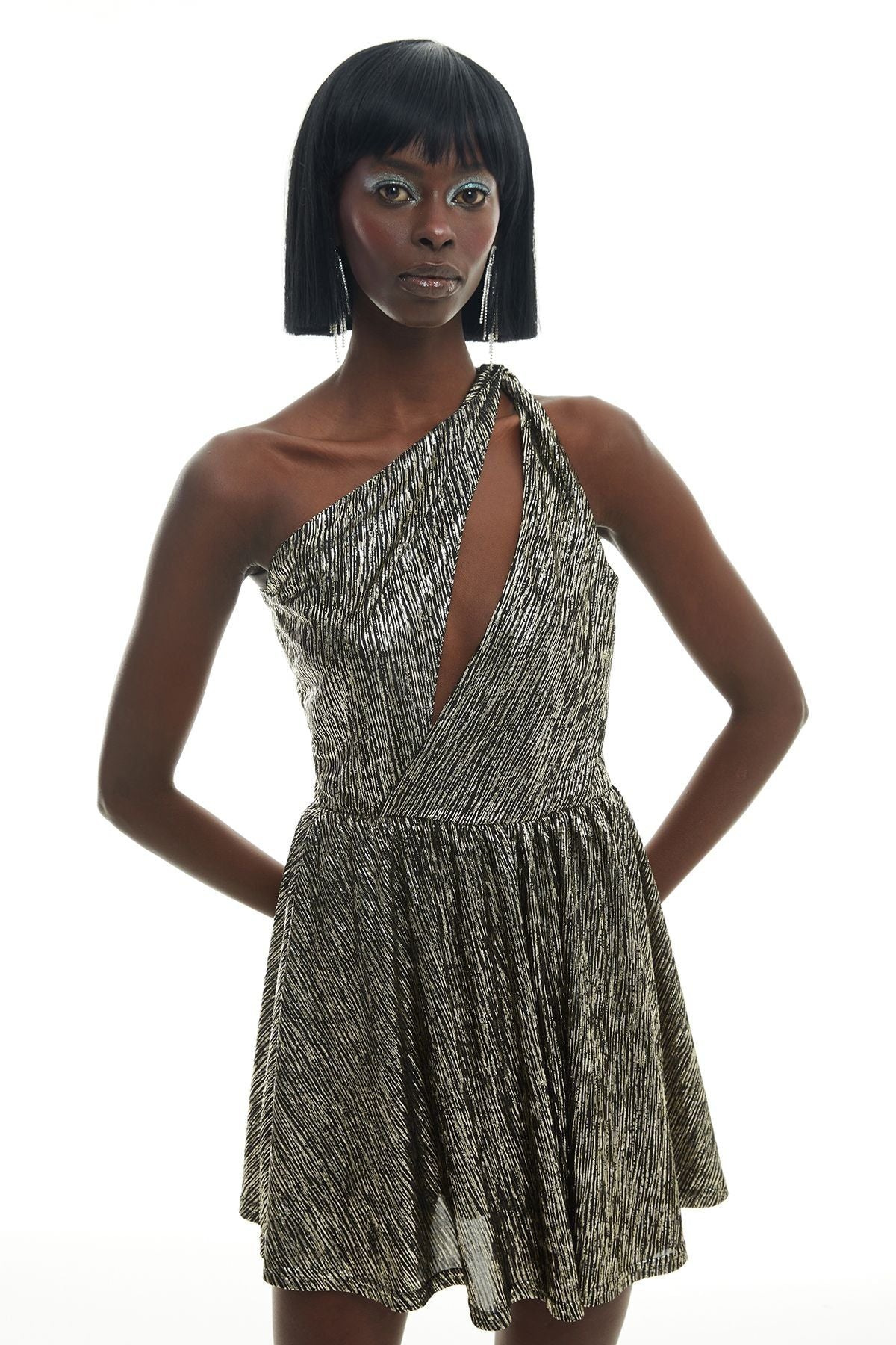 Shiny one-shoulder mini dress with a lined, concealed side zip fastening, low-cut front and back.