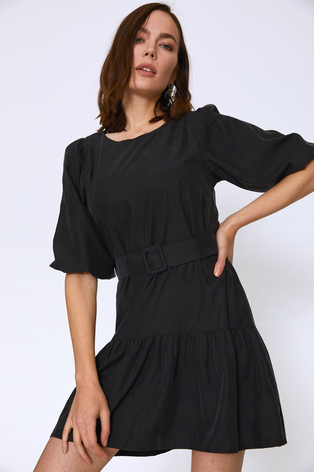 Square Neck Pleated Dress Black